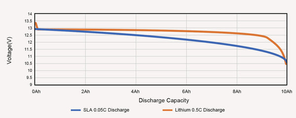 Lithium battery delivers the same amount of power throughout the entire discharge cycle, while an SLA battery output strong power at the beginning, but gets gradually decreased.