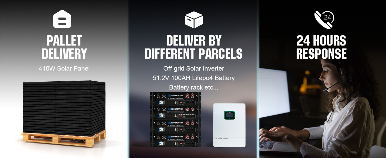 (The 410W solar panels are so large that they can only be shipped on pallets.(They also need to be returned on pallets).If there is any damage upon receipt, please indicate the quantity of damage on the receipt and we're here to help..As the truck driver needs to contact you before delivery, please provide the common correct phone number.)