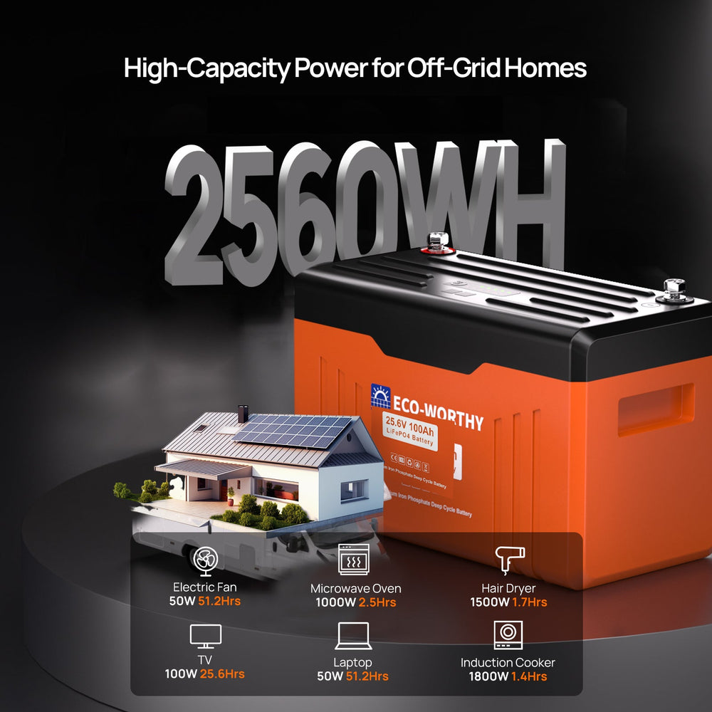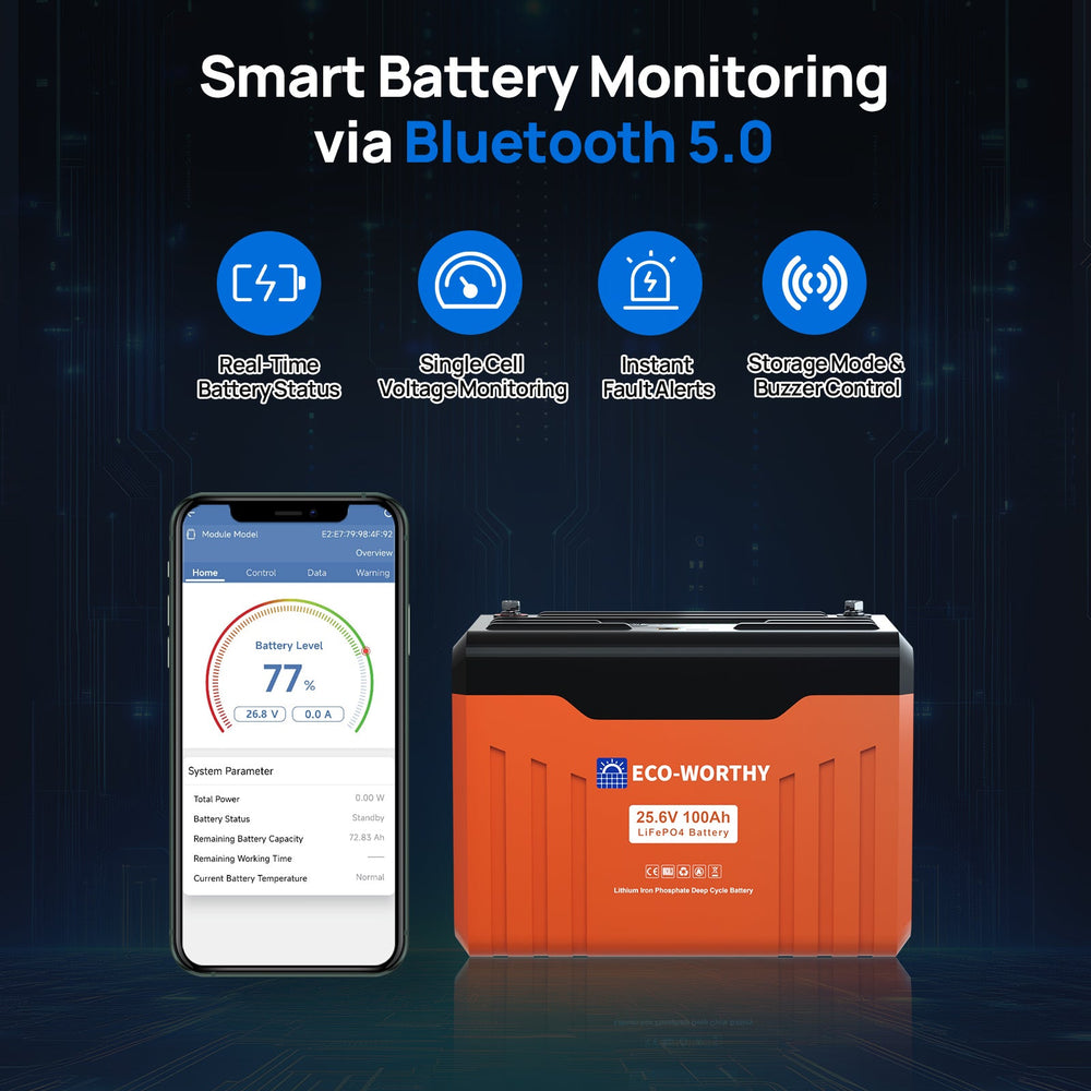ECO-WORTHY 24V 100Ah Bluetooth Lithium Battery with BMS is designed to deliver stable, high-efficiency energy storage for solar, off-grid, and mobile power systems that require higher voltage configurations. Built with advanced lithium iron phosphate technology, this battery offers long cycle life, consistent discharge performance, and enhanced safety compared to traditional lead-acid solutions.The integrated Battery Management System (BMS) actively protects against overcharge, over-discharge, overcurrent, and short circuits, helping ensure reliable operation under demanding conditions.