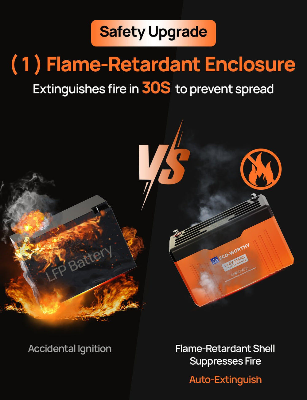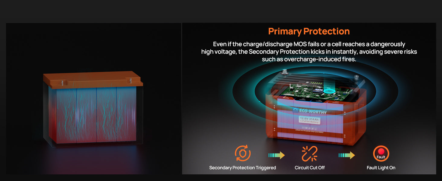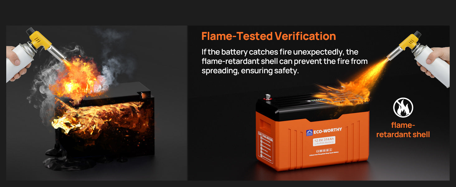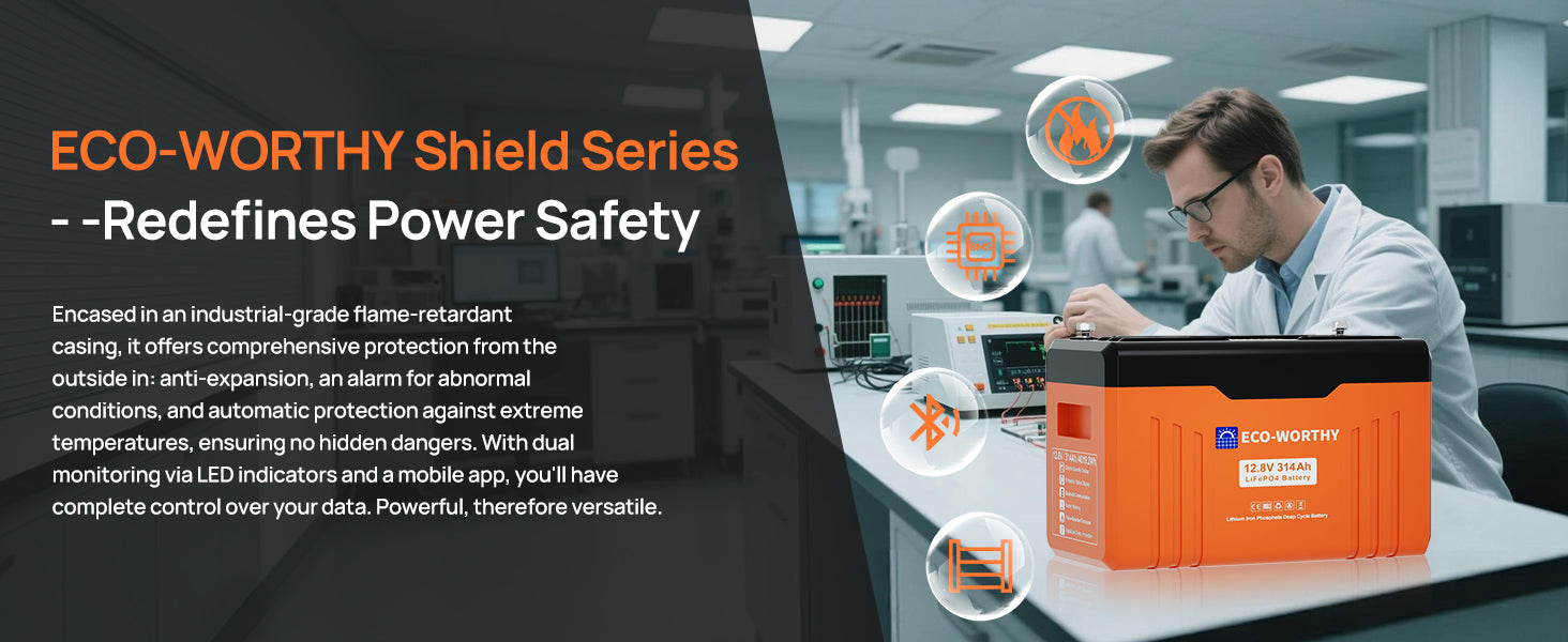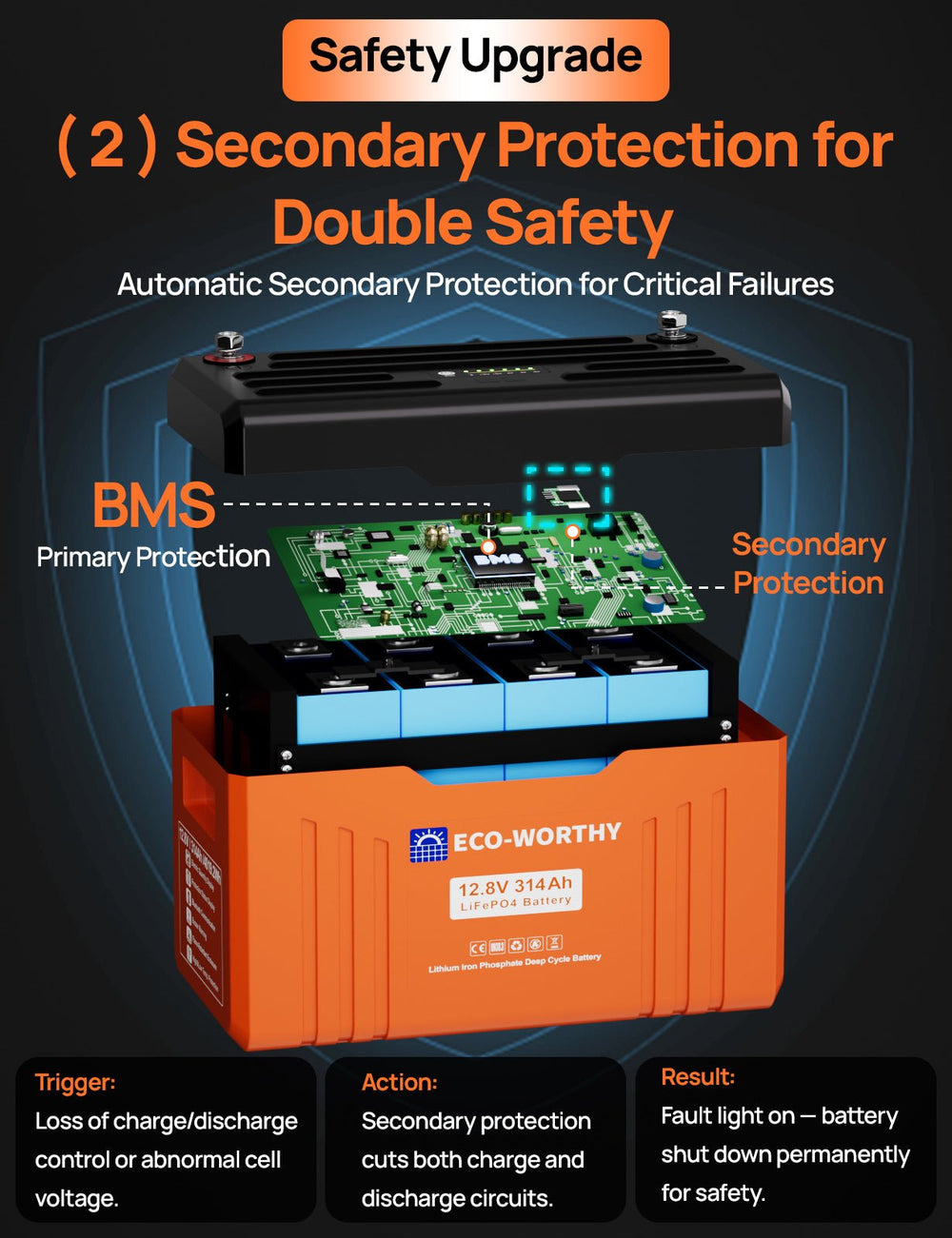 ECO-WORTHY 12V 314AH​ LiFePO4 Lithium Battery with Bluetooth and Battery Status Display, 200A BMS with Low Temperature Protection,It has twice the power, half the weight, and lasts 8 times longer than a sealed lead acid battery, no maintenance, extremely safe and very low toxicity for environment. Our line of LiFePO4 offer a solution to demanding applications that require a lighter weight, longer life and higher capacity battery.