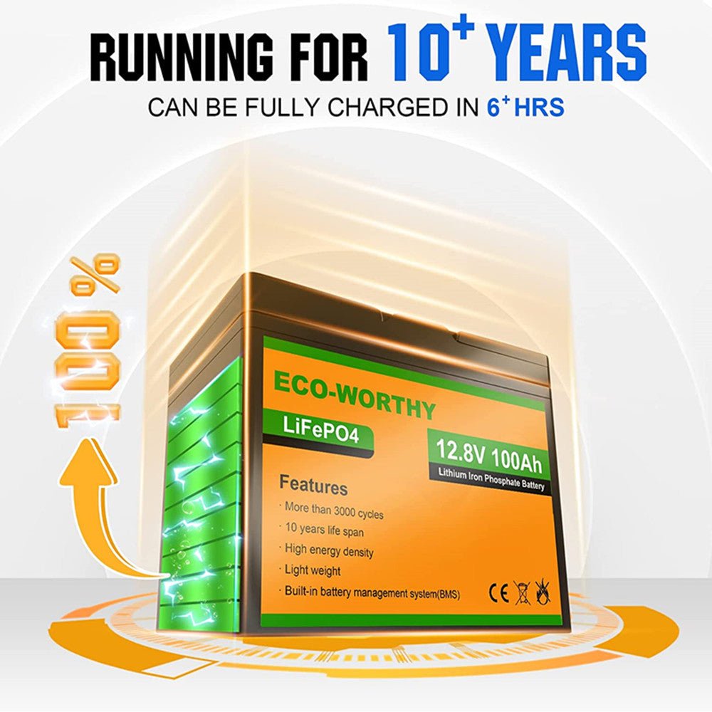 ECO-WORTHY LiFePO4 Lithium Iron Phosphate Battery has twice the power, half the weight and lasts 8 times longer than a sealed lead acid battery.
