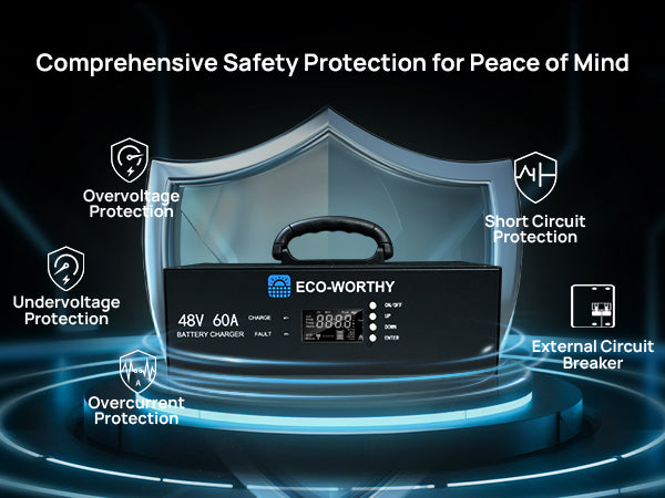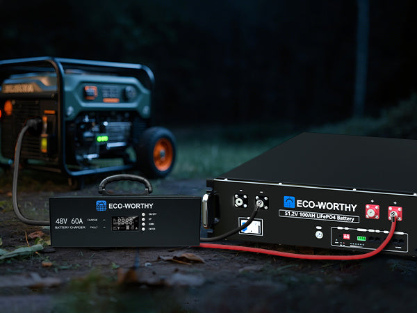 Smart Charging with CAN Communication: Features timed charging and CAN compatibility with ECO-WORTHY 48V 100AH cabinet batteries for safer, intelligent charging.