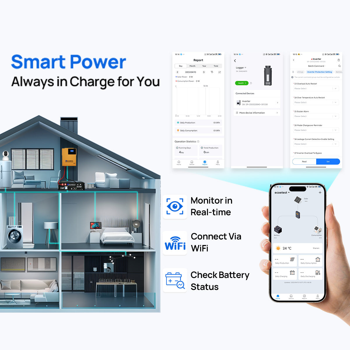 [Modes on Demand, Power with Ease] 4 charging modes: PV-priority、utility-priority、hybrid charging、only solar charging. 3 operating modes: PV-priority, utility-priority, and battery-priority. With 20ms switching uninterruptible power supply