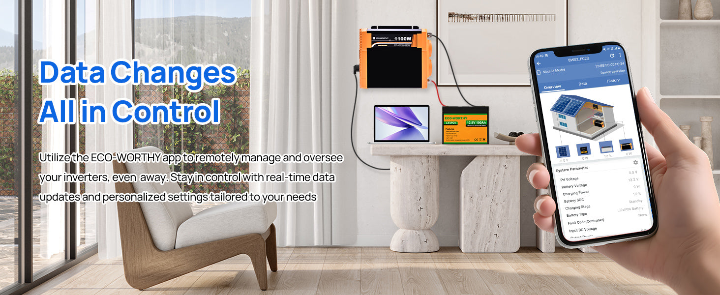 [ Remote-Real-time monitoring systems ]: 1100W inverter with Bluetooth Module, you can monitor the inverter status anytime and anywhere through APP, including battery voltage, output load power, temperature, current and other data.