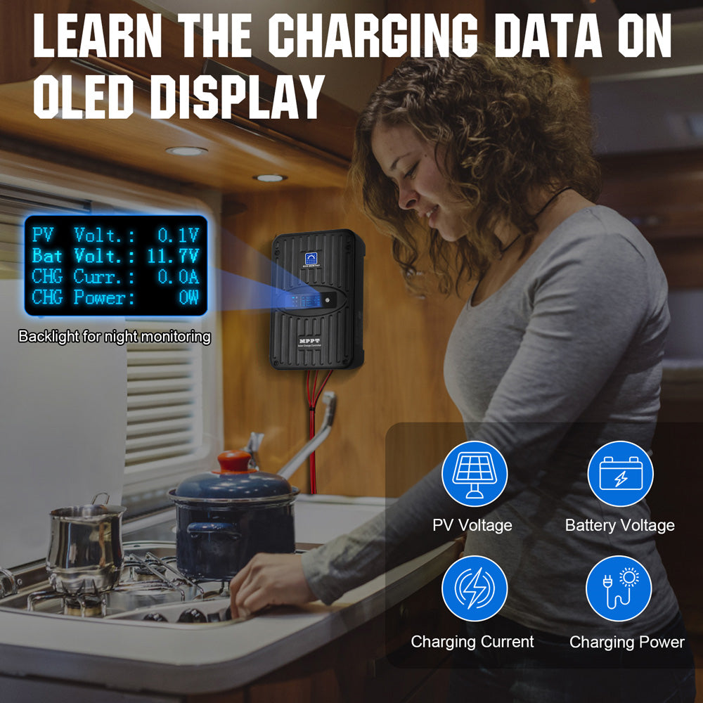 ·OLED Screen for Real-time Monitoring: Equipped with OLED screen, which can dispaly the status of PV voltage, battery voltage, charging current, charging power, and the button can be used to change the battery type settings.
