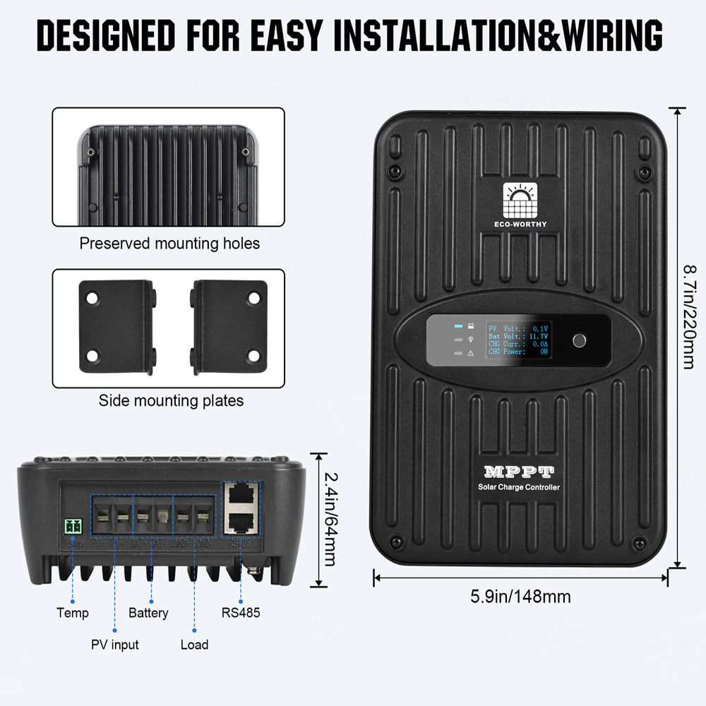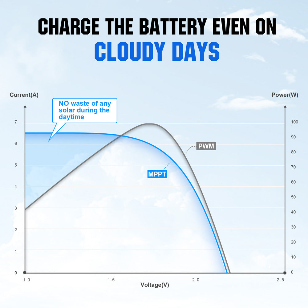 ·99% Efficient MPPT Technology: Maximum Power Point Tracking technology with a high tracking efficiency of up to 99% and peak conversion efficiency of 98%, 40% more than traditional PWM charge controller. It can keep a stable charging current even on cloudy days, making no waste of any sunlight.