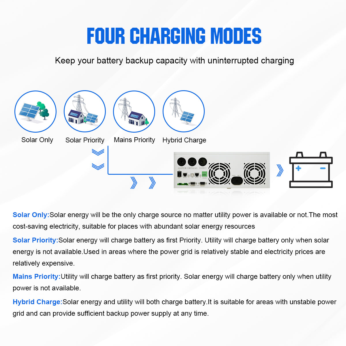 ·Segmented Charing/Discharging: 3 output modes: mains priority and, battery priority, PV priority; uninterrupted power supply. Available in 4 charging modes: Only Solar, Mains Priority, Solar Priority and Mains & Solar hybrid charging. Set a flexible time period for mains charging/discharging according to the local mains condition, and help you save the mains.