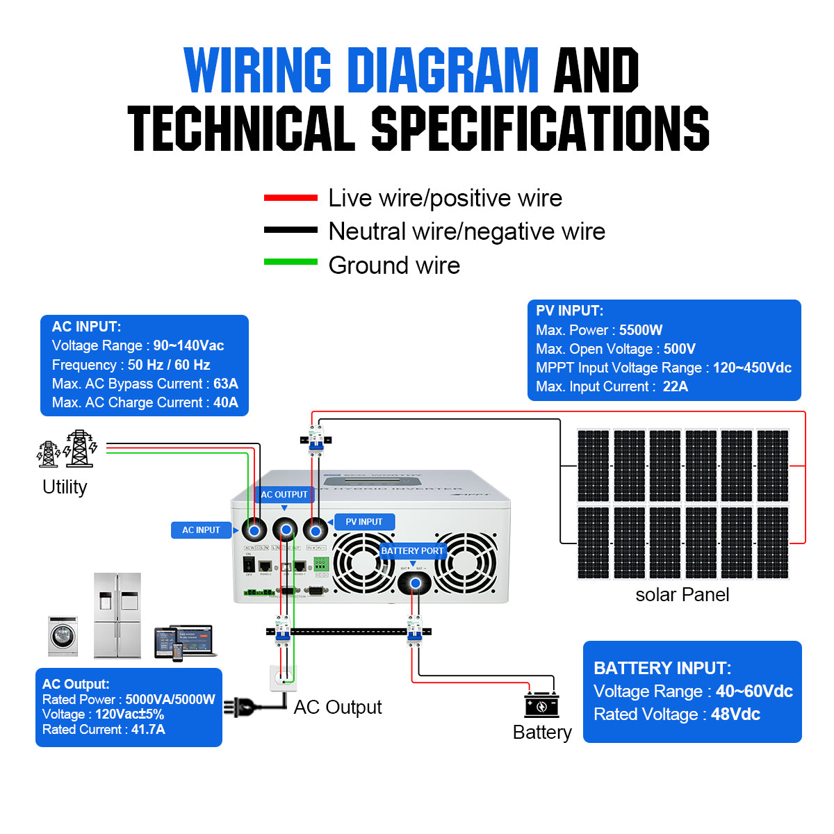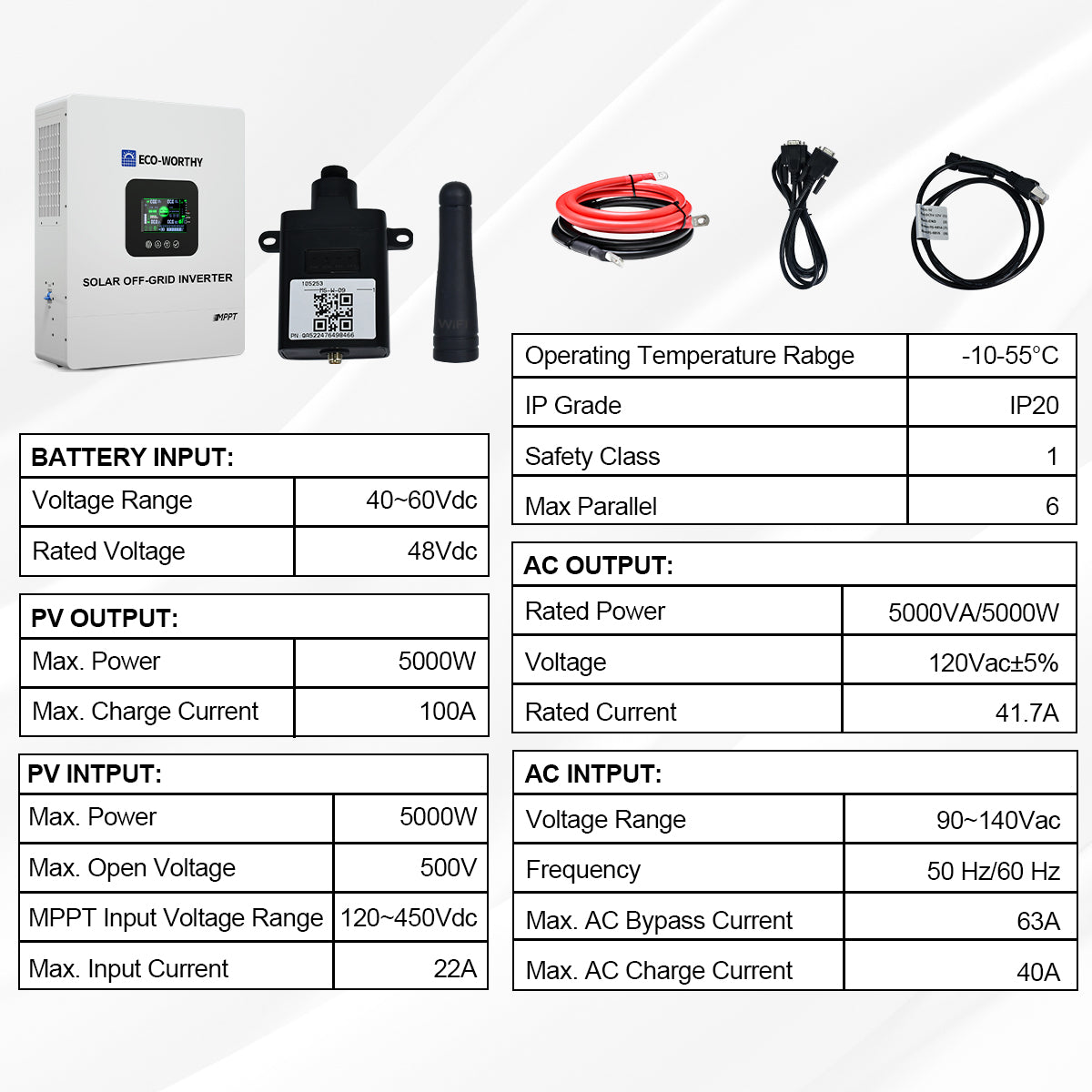 ·Technical Specifications: Max.PV input power: 5500W, PV input voltage range: 120-500V DC, Max.MPPT Charging Current: 80A, Rated Output Power: 5000W, Max.Peak Power: 10000W, Rated OutputVoltage: 120/240Vac.(split phase/single phase)
