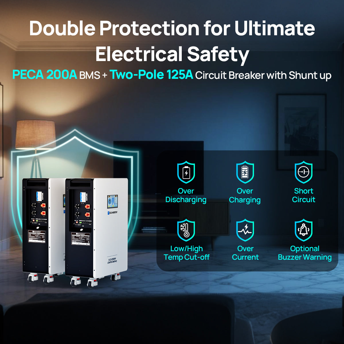 Built-In Safety You Can Trust Designed with U.S. homeowners in mind, this battery includes advanced temperature, surge, and voltage protection. A heavy-duty circuit breaker shuts everything down instantly in case of emergencies—keeping your home and family safe.