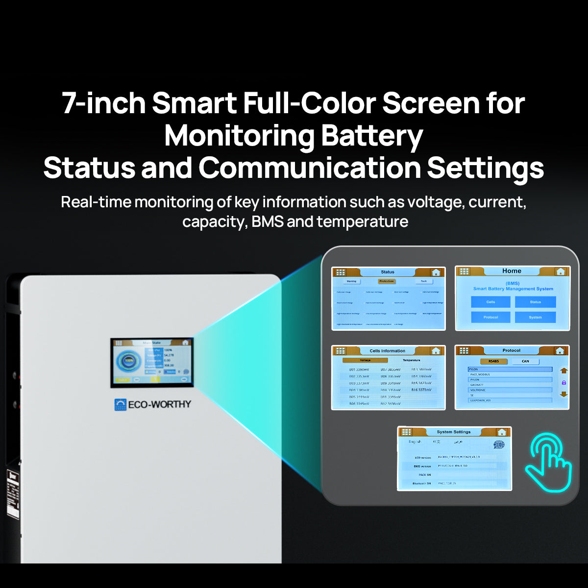 Easy-to-Read Smart Display No guesswork—an oversized screen shows you real-time battery status, including energy left, voltage, temperature, and system health. Plus, it connects easily with inverters or your monitoring system for seamless control.