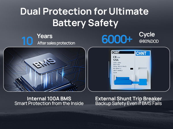 4. Safe & Built to Last – Rugged full-metal casing, 100A BMS with low-temp protection, plus dual circuit protection (breaker + shunt). Overcharge, over-discharge, and short-circuit safeguards keep your home and family safe.