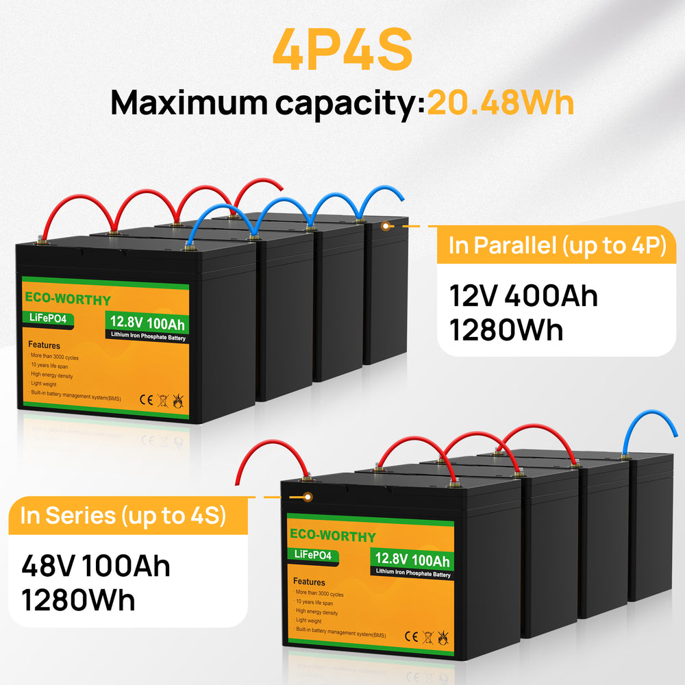 ·Multiple Applications: ECO-WORTHY 12V 100Ah LiFePO4 lithium batteries can be used for RV, 50~86 lbs trolling motor, camping, marine, backup power, solar home off-grid system, lighting, TV, electronic robots, speakers, coffee makers, air conditioners, refrigerators, heaters and so on. It can support 4 series and 4 parallel, up to 20.48KWh.