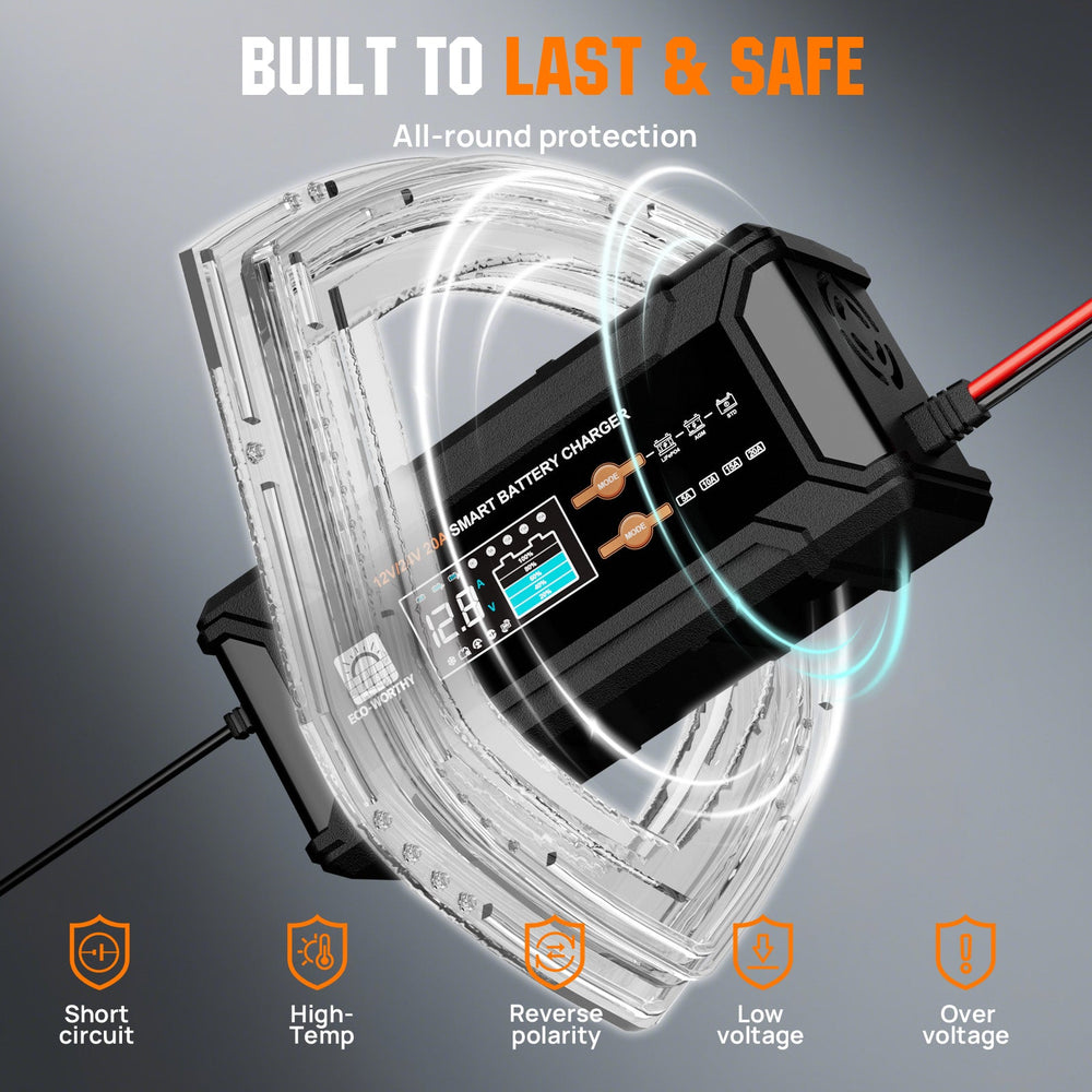 All-in-One Battery Charger Solution: From LiFePO4 batteries to lead-acid batteries, this universal charger combines multiple safety protections(reverse polarity, short circuit, high temperature protection), an intuitive LCD backlight screen, and a sturdy structure. Portable,efficient,and ready for any charging challenge