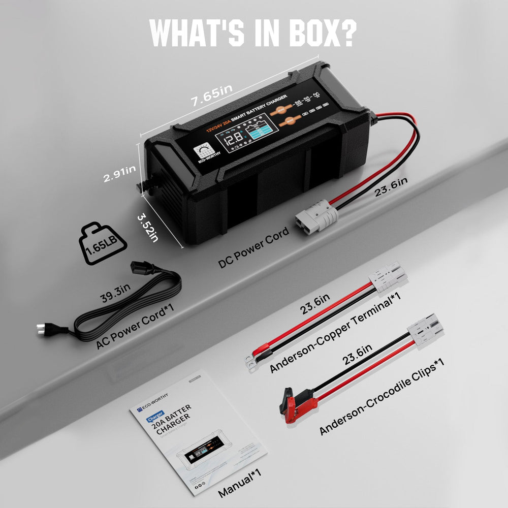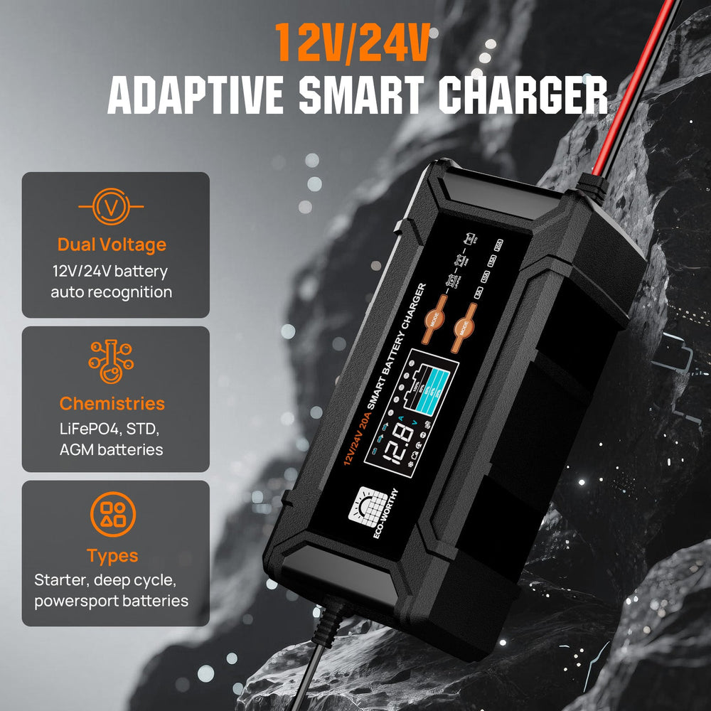 20A 12V/24V Smart Battery Charger with LCD Display for Most Batteries
