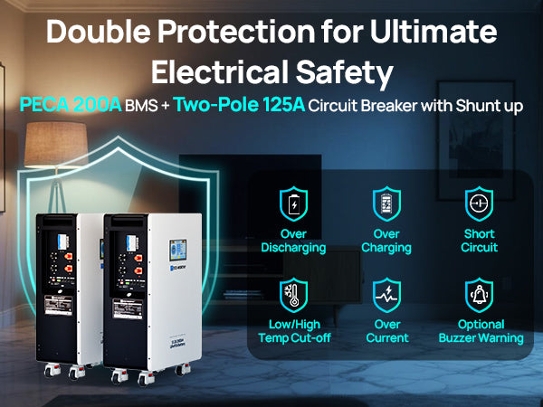 Built-In Safety You Can Trust Designed with U.S. homeowners in mind, this battery includes advanced temperature, surge, and voltage protection. A heavy-duty circuit breaker shuts everything down instantly in case of emergencies—keeping your home and family safe.