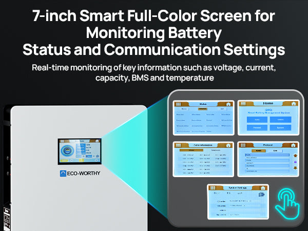 Easy-to-Read Smart Display No guesswork—an oversized screen shows you real-time battery status, including energy left, voltage, temperature, and system health. Plus, it connects easily with inverters or your monitoring system for seamless control.