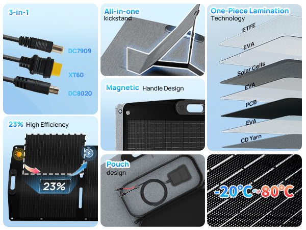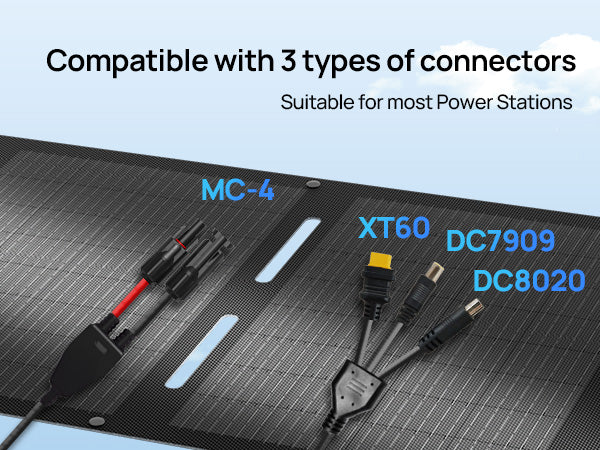 Extensive Device Compatibility:Equipped with a 59-inch integrated cable (XT60/DC7909/DC8020), our foldable solar panel seamlessly connects to most power stations and devices for camping, RV trips, and outdoor charging
