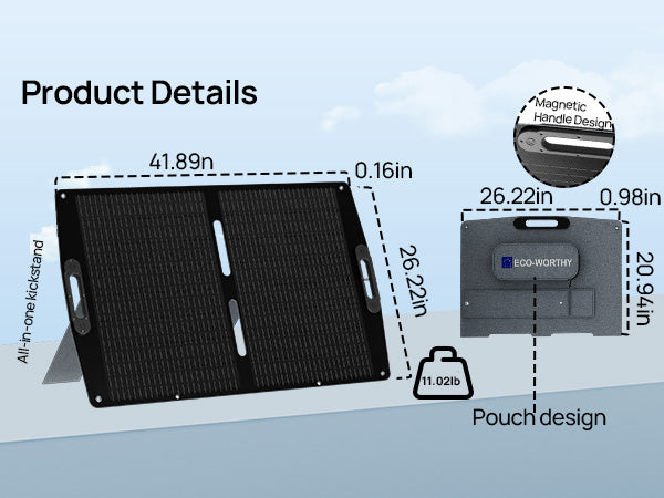 Portable & Versatile: The travel solar panel weighs only 11 lbs and folds compactly (20.94"x26.22"x0.98"). Equipped with mounting holes and Kickstand enable quick deployment for backpacking, fishing, and off-grid etc.