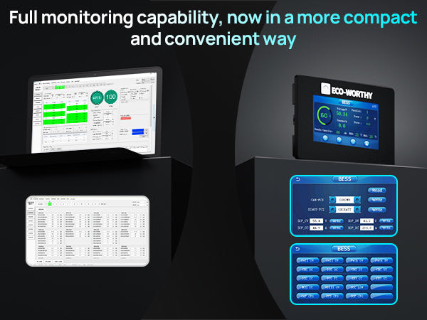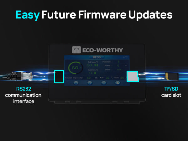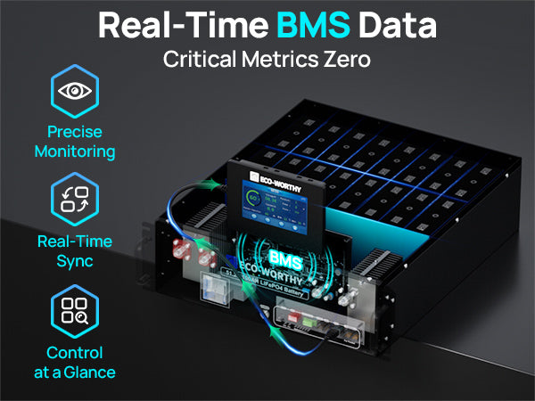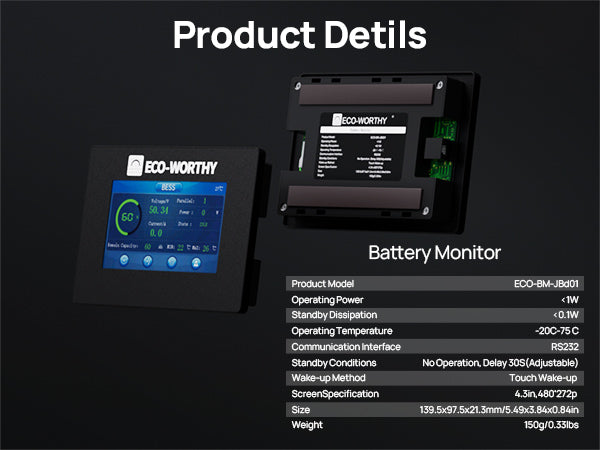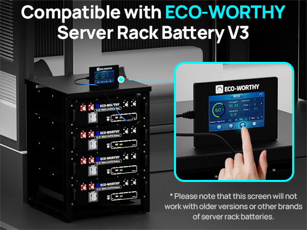 Purpose-built for a 48V/51.2V 100Ah server rack battery, this ECO-WORTHY touchscreen monitor offers plug-and-play installation, smart magnetic mounting, and instant real-time data. User-friendly, multi-language, and easily upgradeable via SD card—it’s the perfect assistant for effortless battery management.