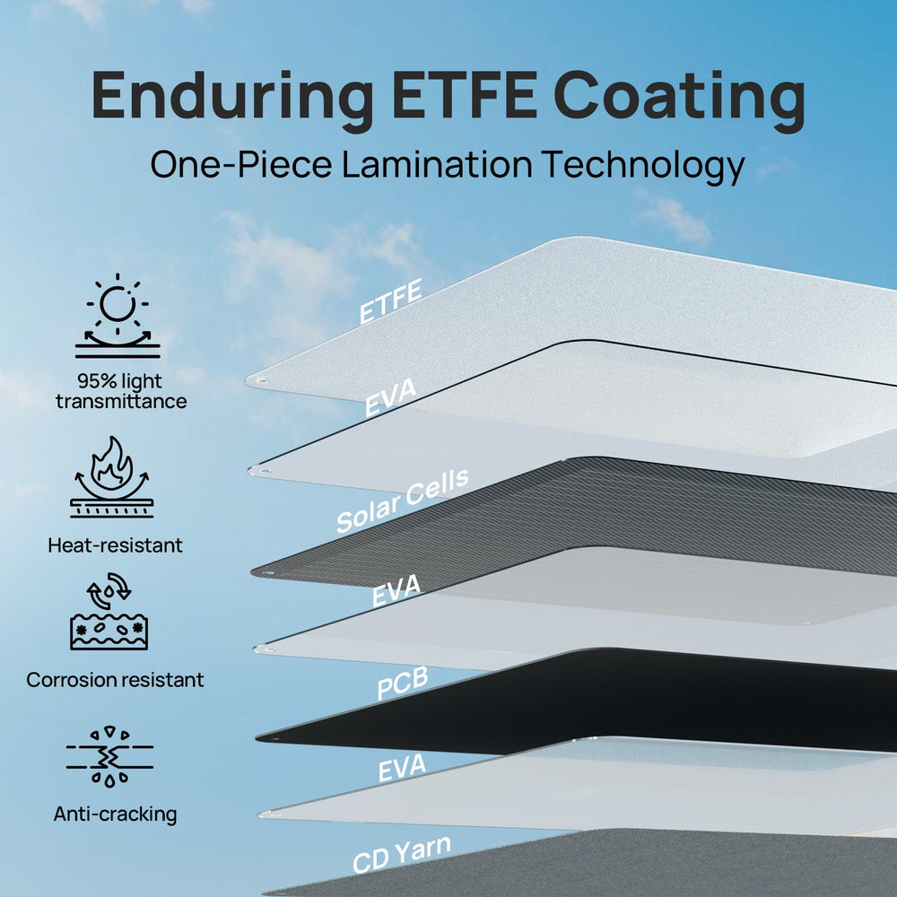 Sturdy and Enduring: 7-layer reinforced structure with laminated encapsulation ensures extended lifespan. ETFE coating provides waterproof, dustproof, and long-lasting durability for harsh outdoor condition