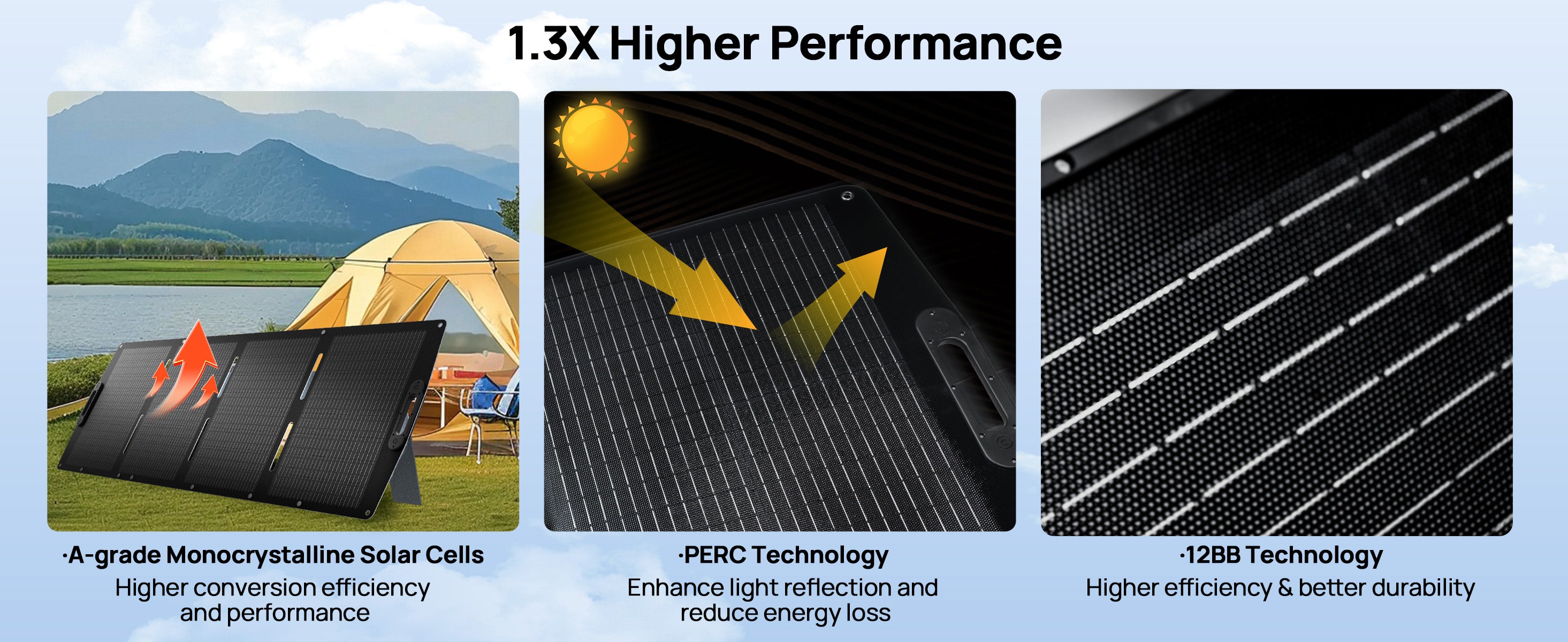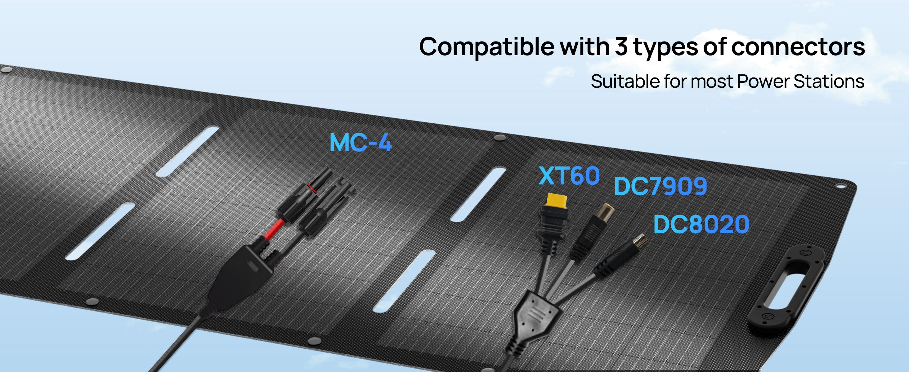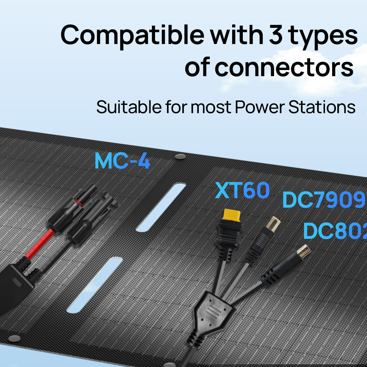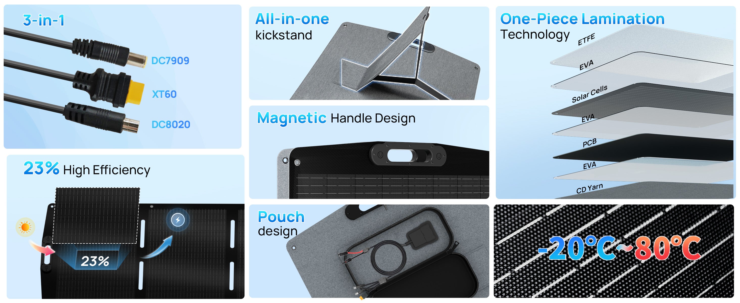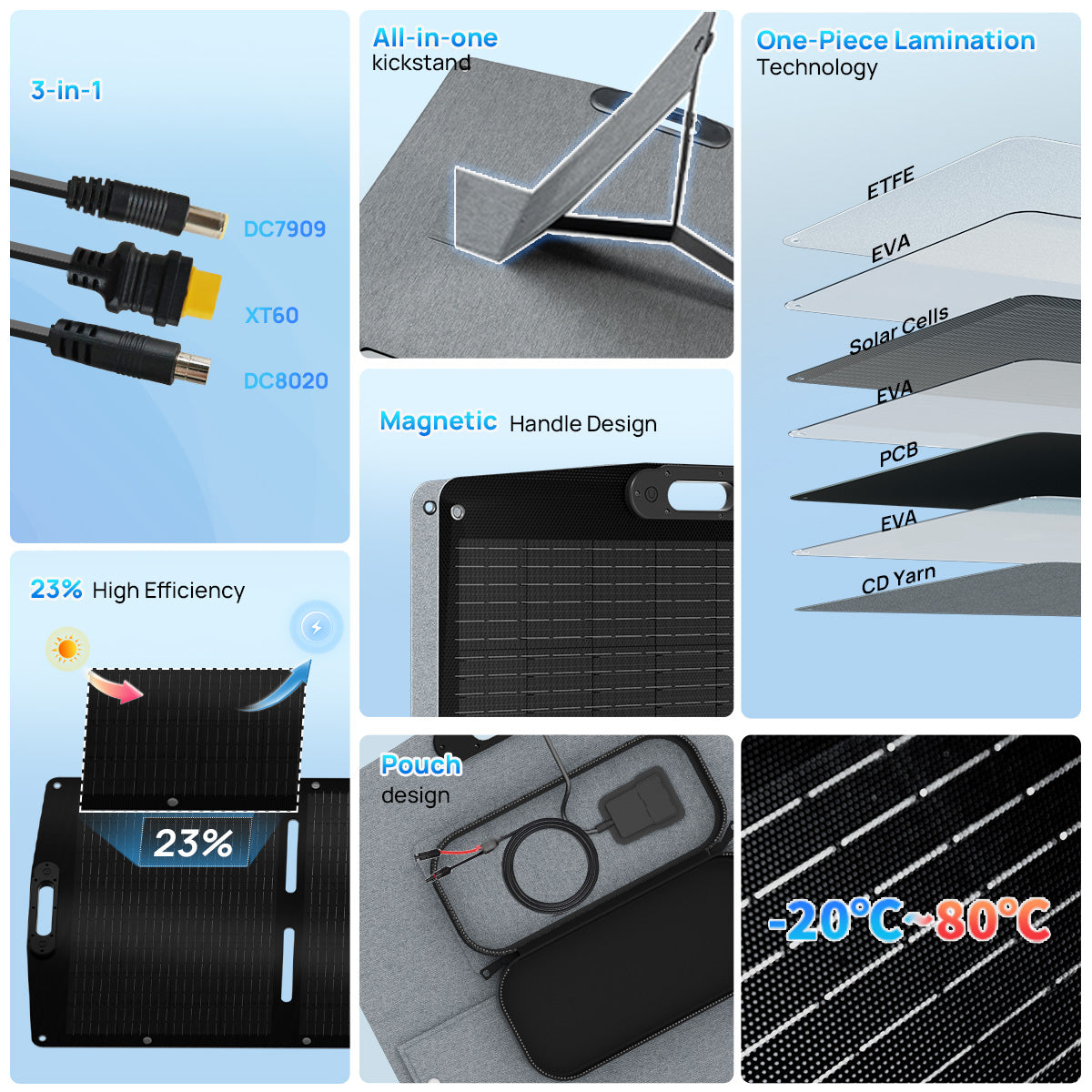 23% High Efficiency: The 200W portable solar panel utilizes Grade-A monocrystalline silicon cells with PERC technology, enhancing sunlight absorption and reflection to achieve 23% high efficiency for superior power generation Extensive Device Compatibility:Equipped with a 59-inch integrated cable (XT60/DC7909/DC8020), our foldable solar panel seamlessly connects to most power stations and devices for camping, RV trips, and outdoor charging Sturdy and Enduring: 7-layer reinforced structure with laminated encapsulation ensures extended lifespan. ETFE coating provides waterproof, dustproof, and long-lasting durability for harsh outdoor condition Adjustable Kickstand for More Efficiency: The 200W folding solar panel has a built-in multi-angle kickstand to optimize sunlight exposure and increase energy harvesting efficiency by over 25% or more Portable & Versatile: The travel solar panel weighs only 22.04 lbs and folds compactly (20.94"x26.22"x1.97"). Equipped with mounting holes and Kickstand enable quick deployment for backpacking, fishing, and off-grid etc. Expandable Power System: The 200W poatable soalr panel supports series/parallel connections to combine multiple panels, flexibly scaling power output for higher energy demands