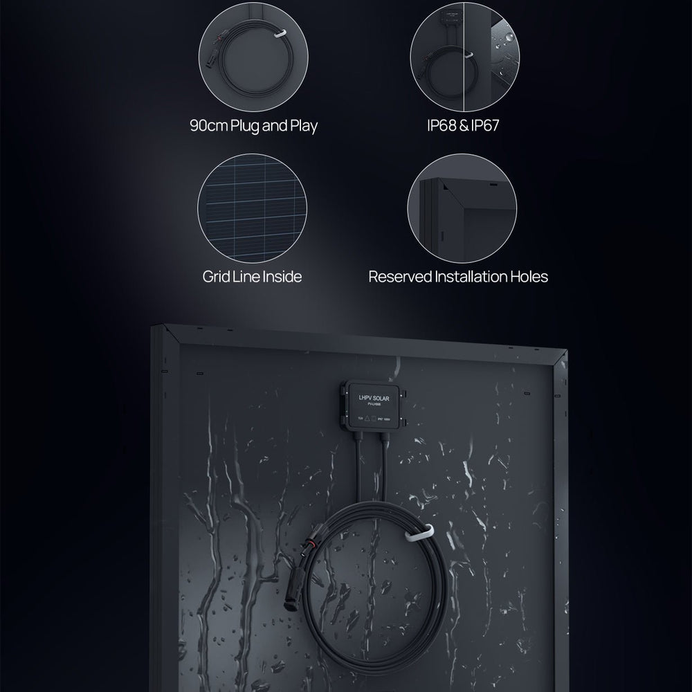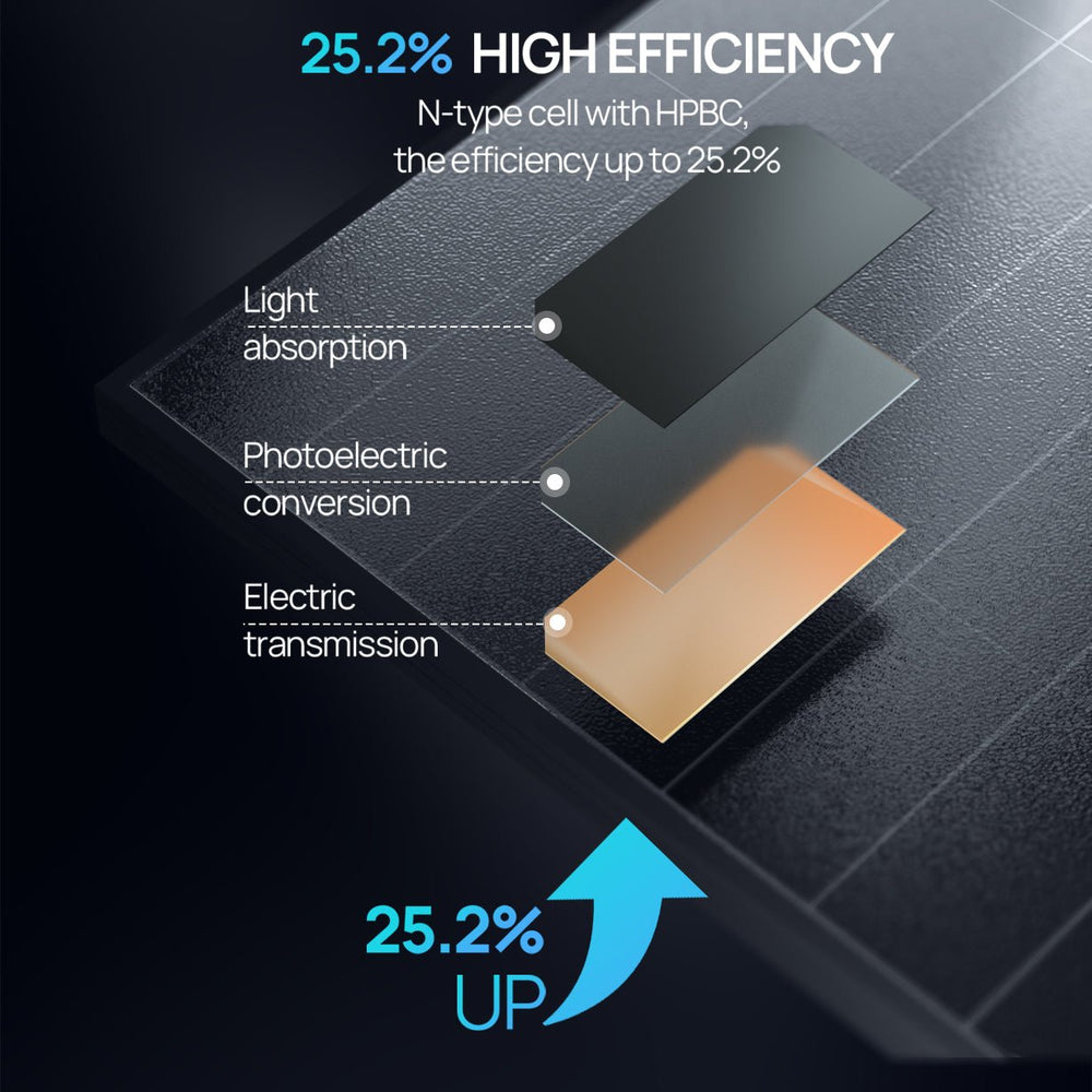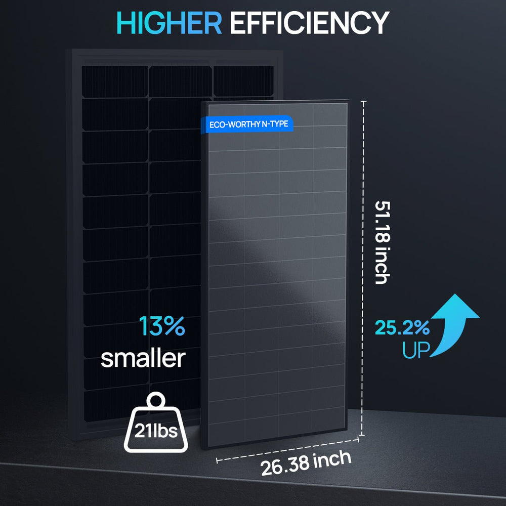 ECO-WORTHY 200W High-Efficiency Solar Panel uses advanced solar cell technology to achieve up to 25.2% conversion efficiency. The front design without metal grid lines maximizes light absorption and output performance. With an IP68 rating, the panel offers strong protection against water and dust, ensuring long-term durability.