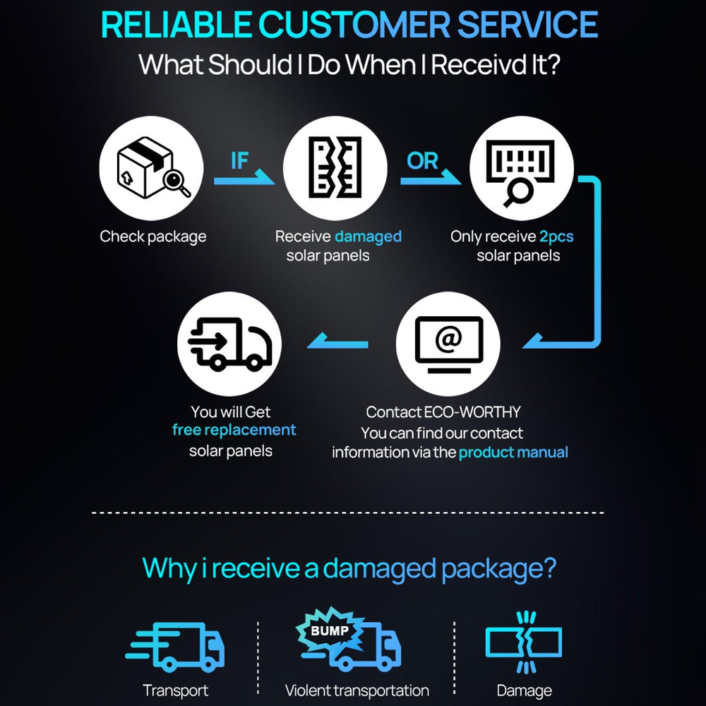ONE-ON-ONE SERVICE:Customer Service Team can reply within 12 hours during weekdays.ECO-WORTHY is committed to providing exclusive customer service and lifelong worry free technical support. Whenever and wherever you have any questions or need assistance, please feel free to contact us and we will be happy to serve you