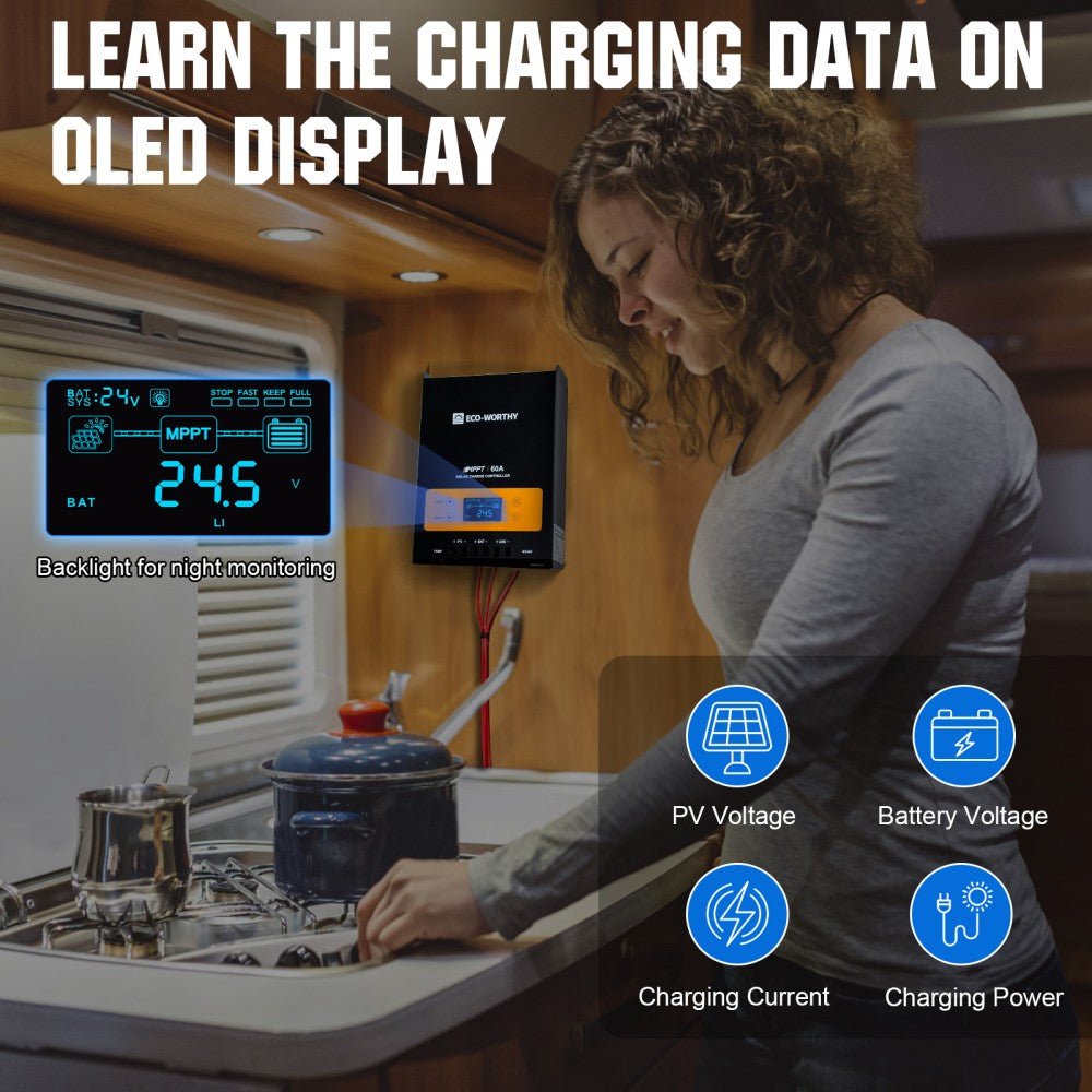 ECO-WORTHY 60A MPPT Charge Controller is the most efficient type of charge controller. With up to 99% tracking efficiency, ensures maximum power point solar charging that gets more energy to your battery bank. It's able to charge and discharge different kinds of 12/24/36/48V battery banks, including Gel, AGM, Lithium, LiFePO4, Flooded and NCM/NCA batteries.