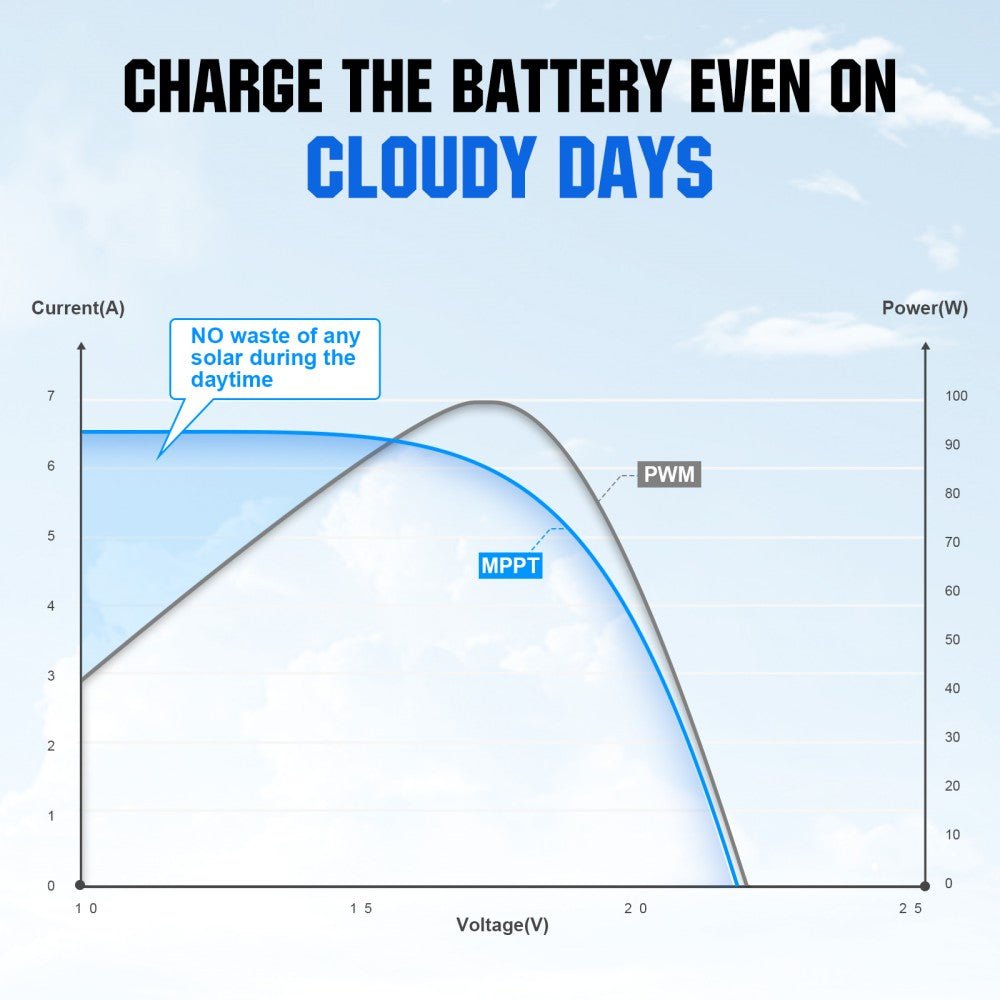·99% Efficient MPPT Technology: Maximum Power Point Tracking technology with a high tracking efficiency of up to 99% and peak conversion efficiency of 98%. It can keep a stable charging current even on cloudy days, making no waste of any sunlight.