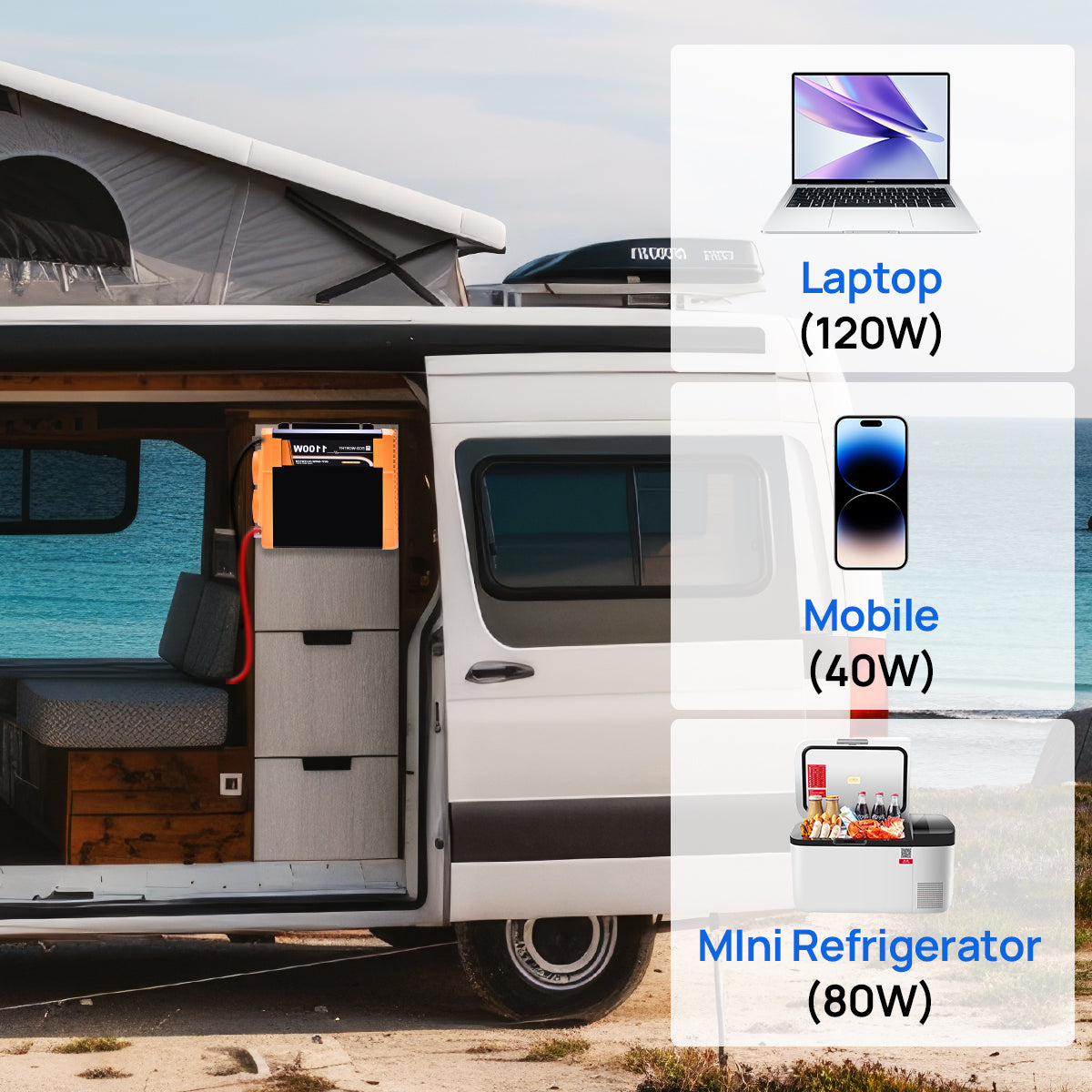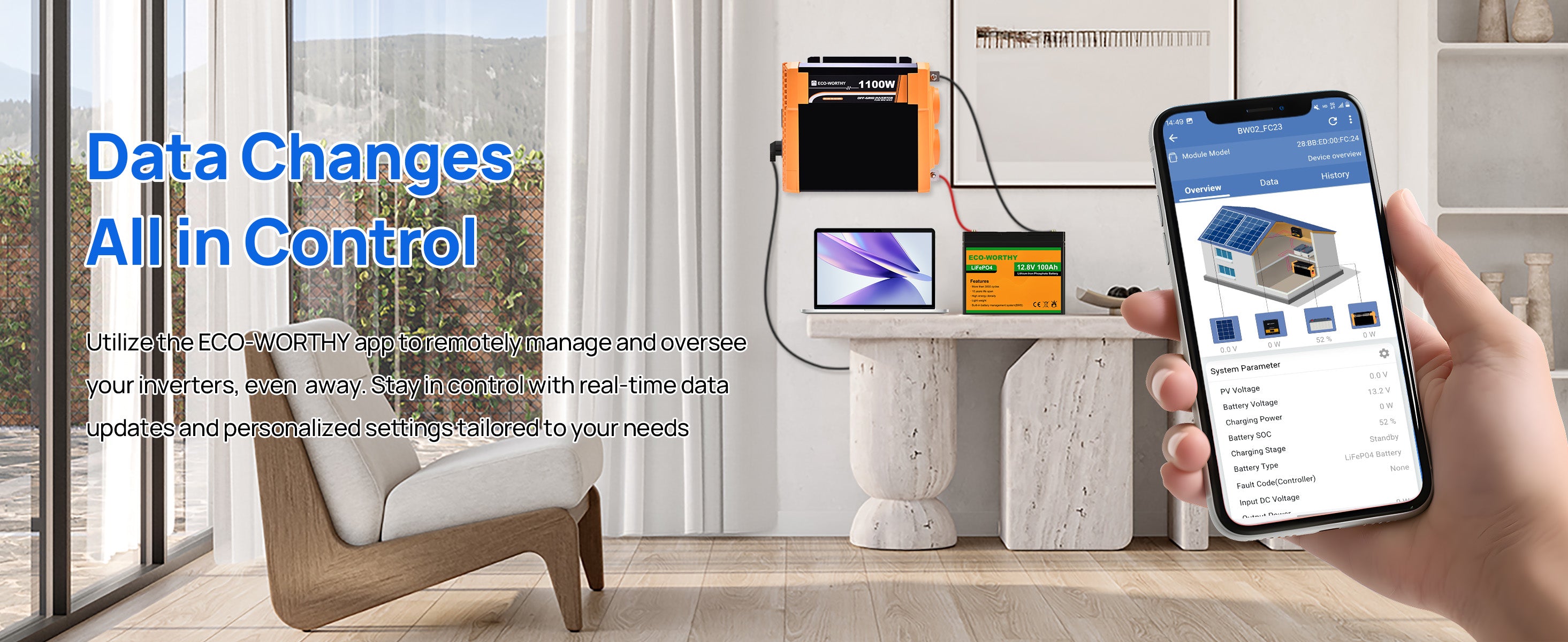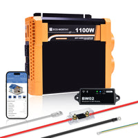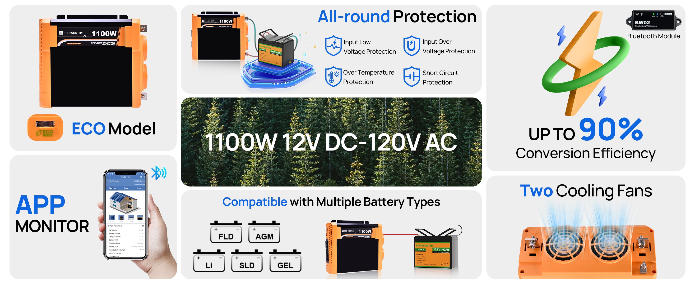 [ Power DC-AC Performence ]: 1100w Pure Sine Wave Power Inverter Provides DC 12V to AC 120V continuous power.Suitable for most electrical appliances in solar systems, homes, RVs, camping, including TVs, mobile phones, laptops, drones, cameras, etc. [ ECO MODE ]: Conserving your system's energy.If you turn on ECO MODE, it will automatically enter ultra-low power standby mode when your load power is below 50W and a It will automatically supply power to the load once connected to a device with more than 50 power. [ Remote-Real-time monitoring systems ]: 1100W inverter with Bluetooth Module, you can monitor the inverter status anytime and anywhere through APP, including battery voltage, output load power, temperature, current and other data. [ Safety Multi-Protection ]: LCD screen with warning message, overload protection,over-voltage protection, the built-in GFCI and double cooling fan,External transparent box with a 100A fuse (replaceable) to ensure heat dissipation and double guarantee your equipment safety. [ What You Get ]: 1*1100W inverter with 2*US 15A AC outlets, 2*18W USB ports(5V/3A, 9V/2A,18W max) & 16.4ft extension cord,4AWG Battery Cable, 100A Fuse Box.