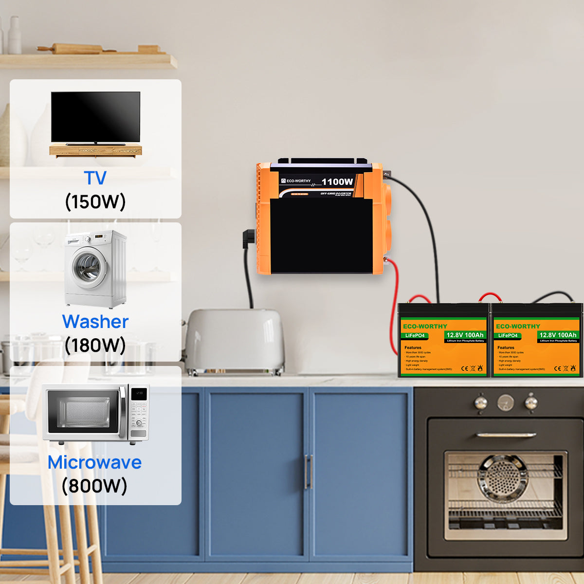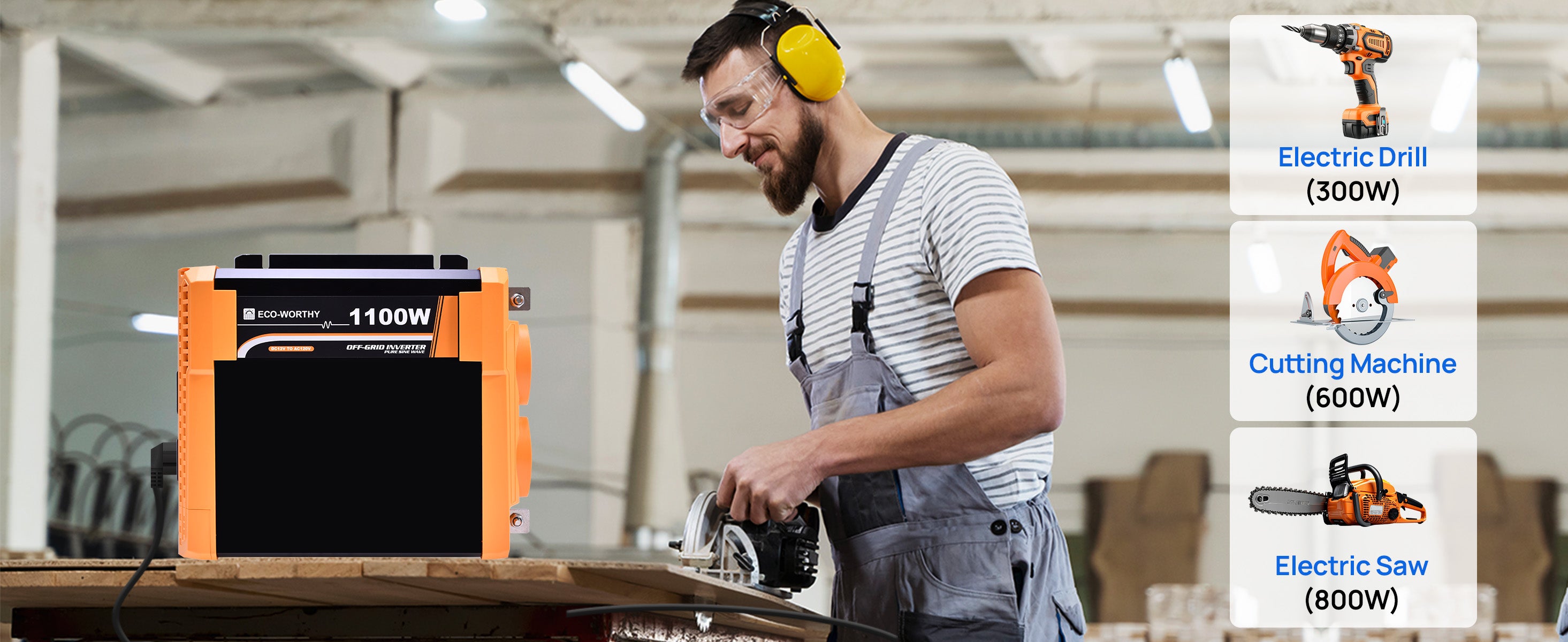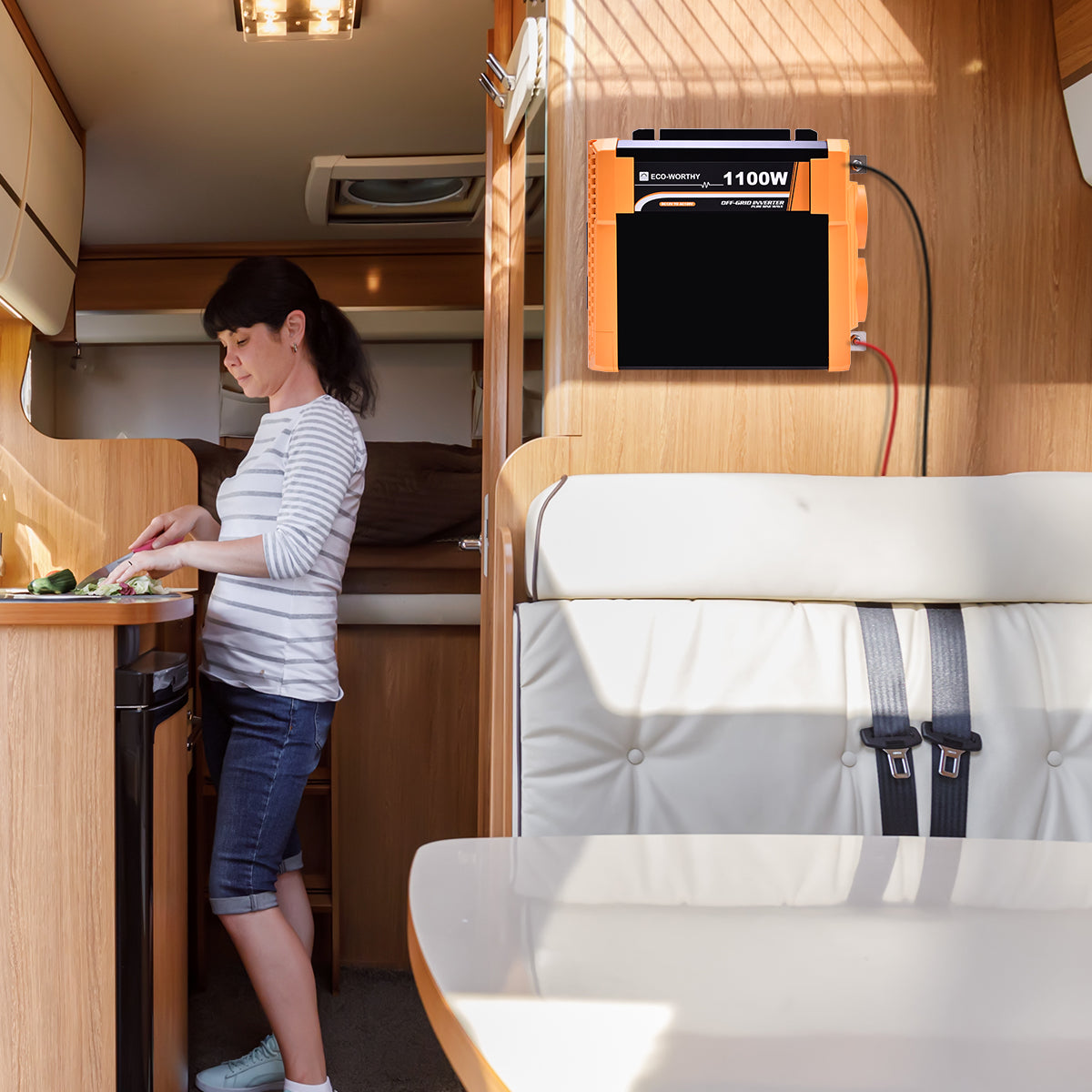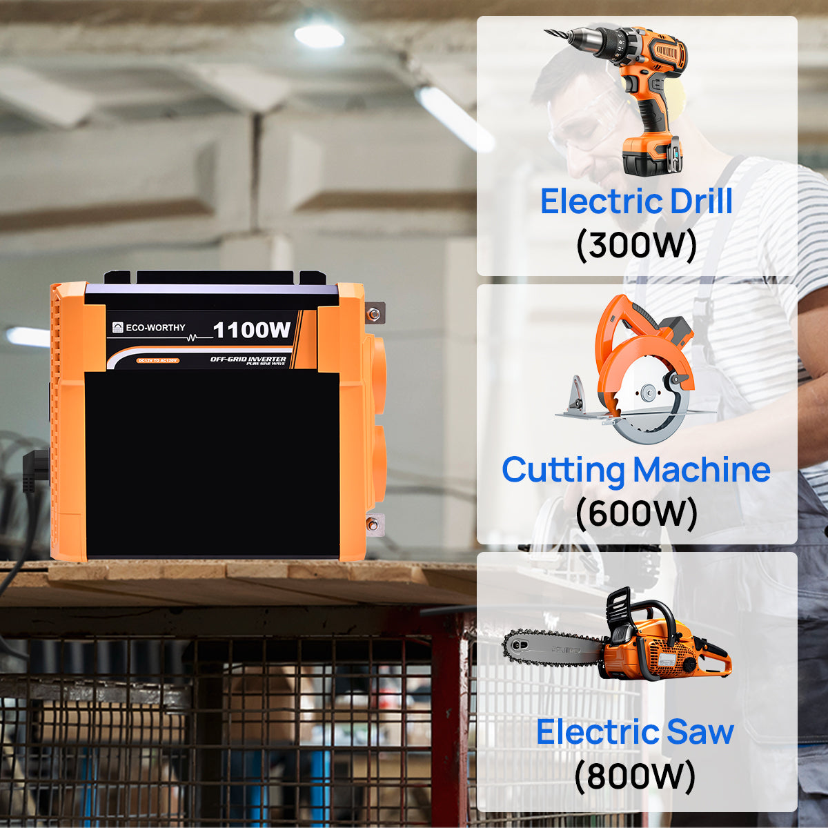 ECO-WORTHY 1100W Off Grid Pure Sine Wave Inverter 12V to 110V is a high-quality solar accessory that is perfect for off-grid systems, including cabins and tiny homes. A power inverter is an electrical device that transforms the DC power stored in batteries into standard household AC power for consumer electronic needs. As a pure sine wave inverter, it is capable of producing cleaner, smoother, quieter, and more reliable electricity to operate tools, fans, lights, and other electronics without interference.