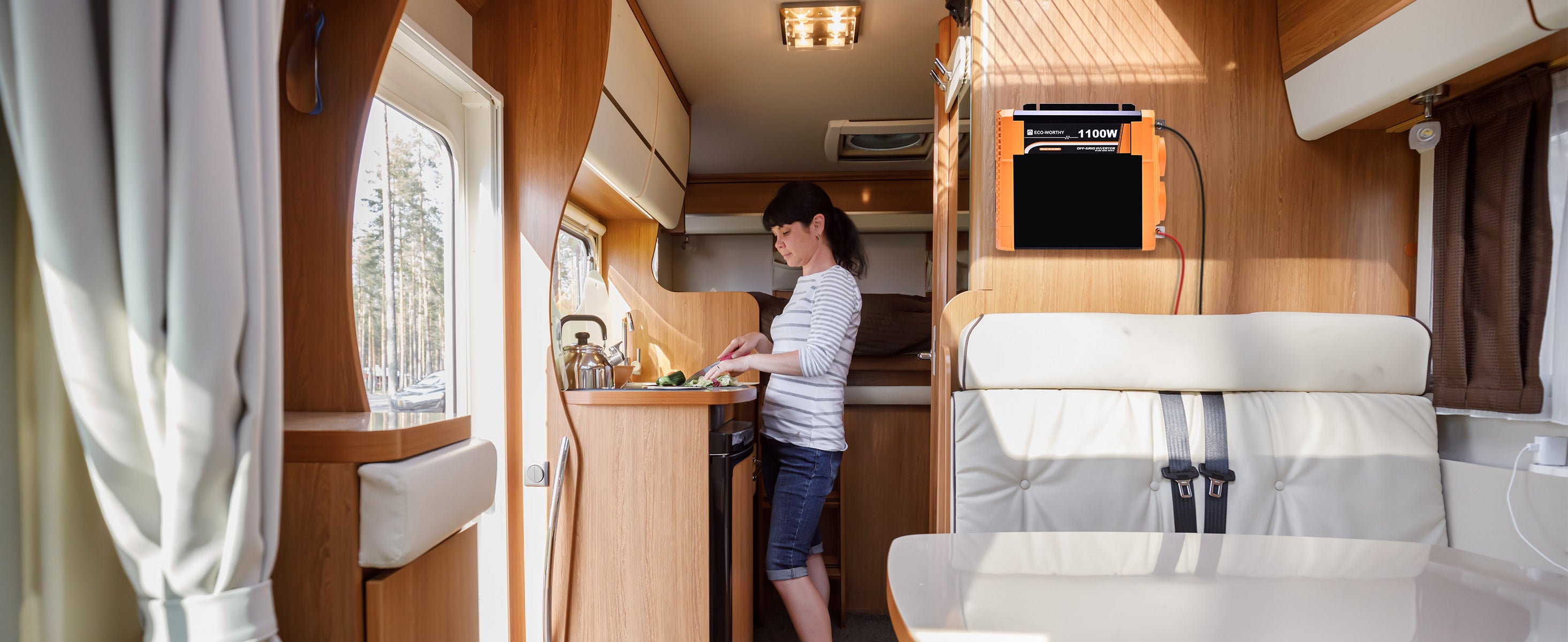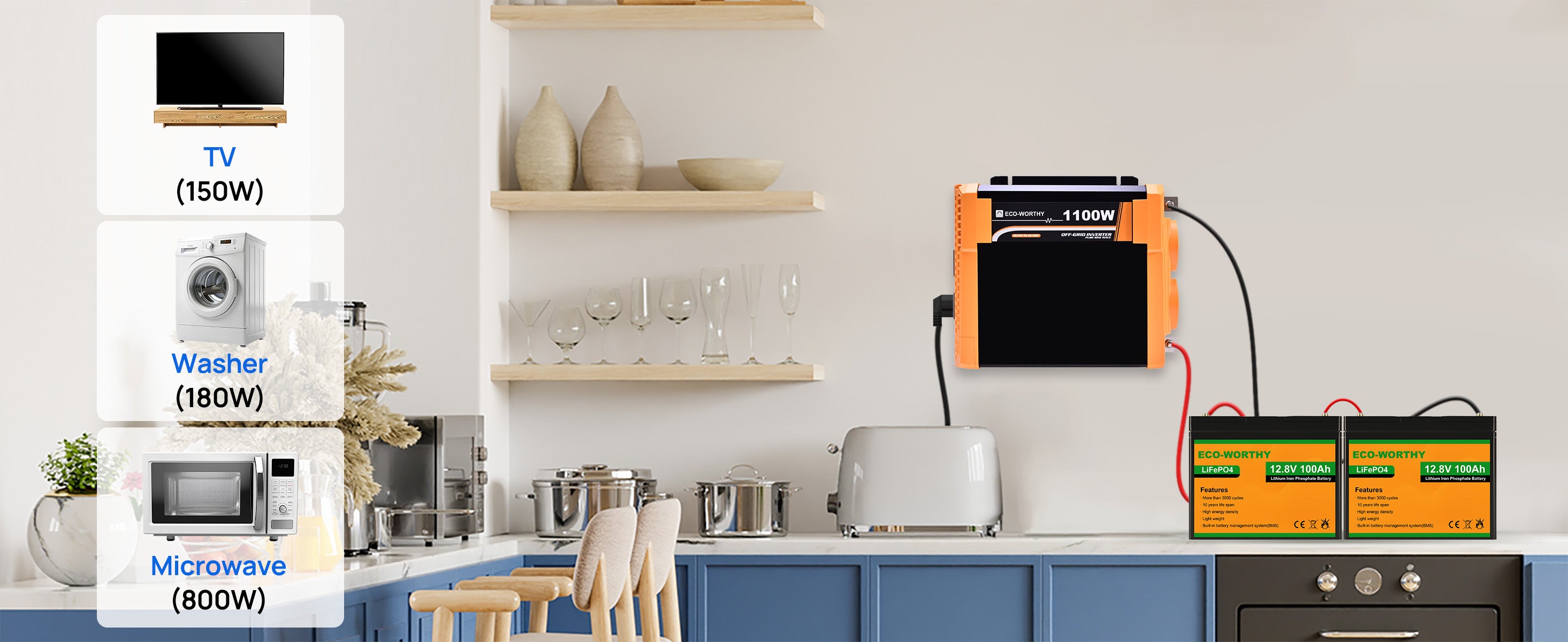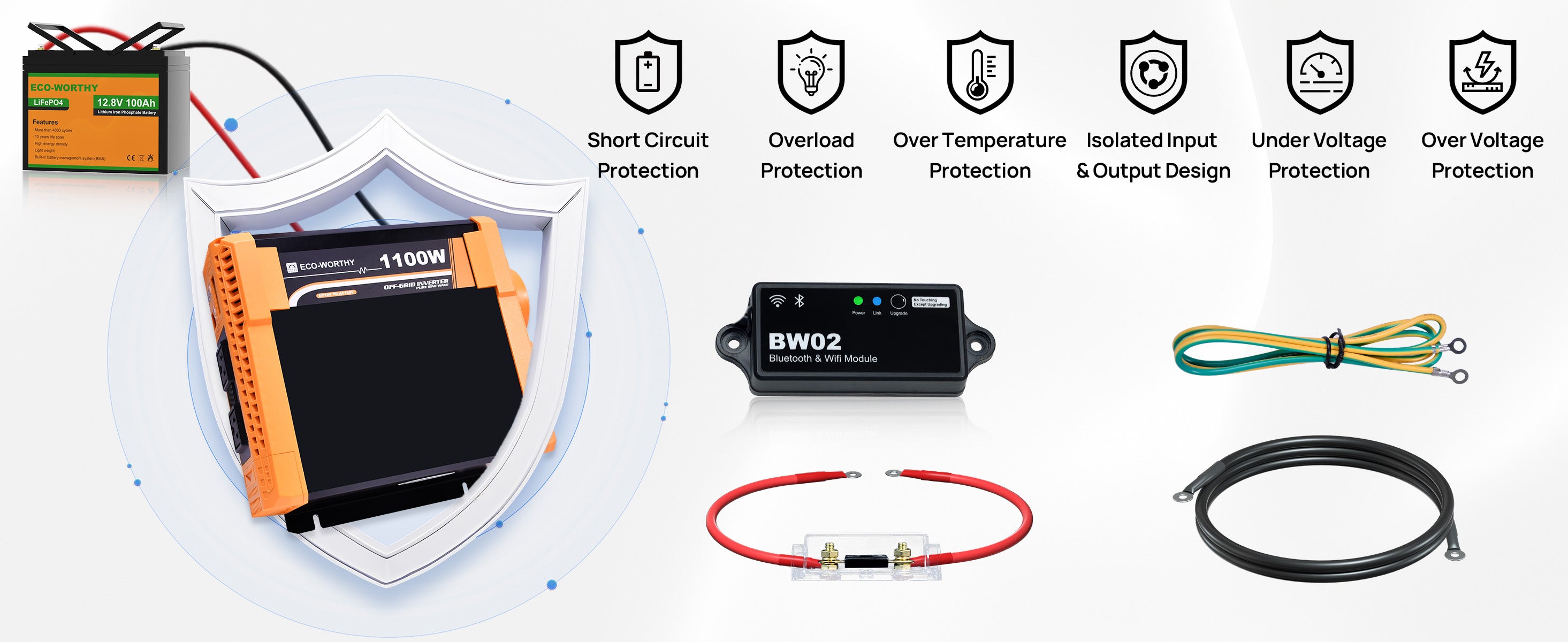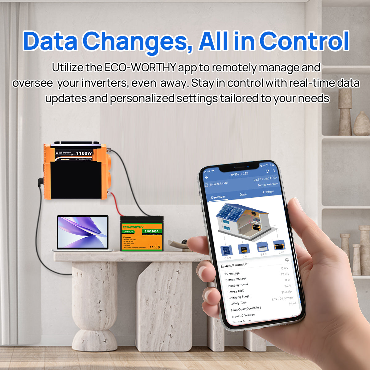 ECO-WORTHY 1100W Off Grid Pure Sine Wave Inverter 12V to 110V is a high-quality solar accessory that is perfect for off-grid systems, including cabins and tiny homes. A power inverter is an electrical device that transforms the DC power stored in batteries into standard household AC power for consumer electronic needs. As a pure sine wave inverter, it is capable of producing cleaner, smoother, quieter, and more reliable electricity to operate tools, fans, lights, and other electronics without interference.
