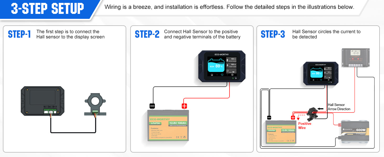 ·Easy to Measure: With Hall sensors, installation is simple and requires no complicated wiring or shunts, making installation quick and easy to measure.