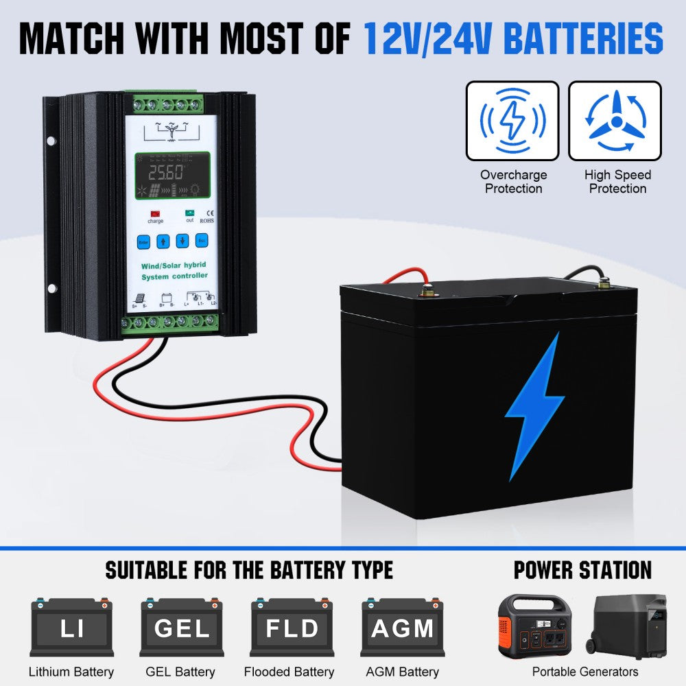 ·PWM Hybrid Controller: The Wind Turbine Generator Power Kit includes a 40A PWM Hybrid Controller for battery protection. It can automatically shut down when the battery is fully charged, protect it from overcharge and short circuit. It's can also be connected to solar panels for hybrid power generation.