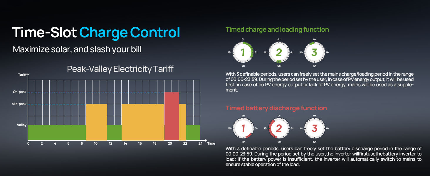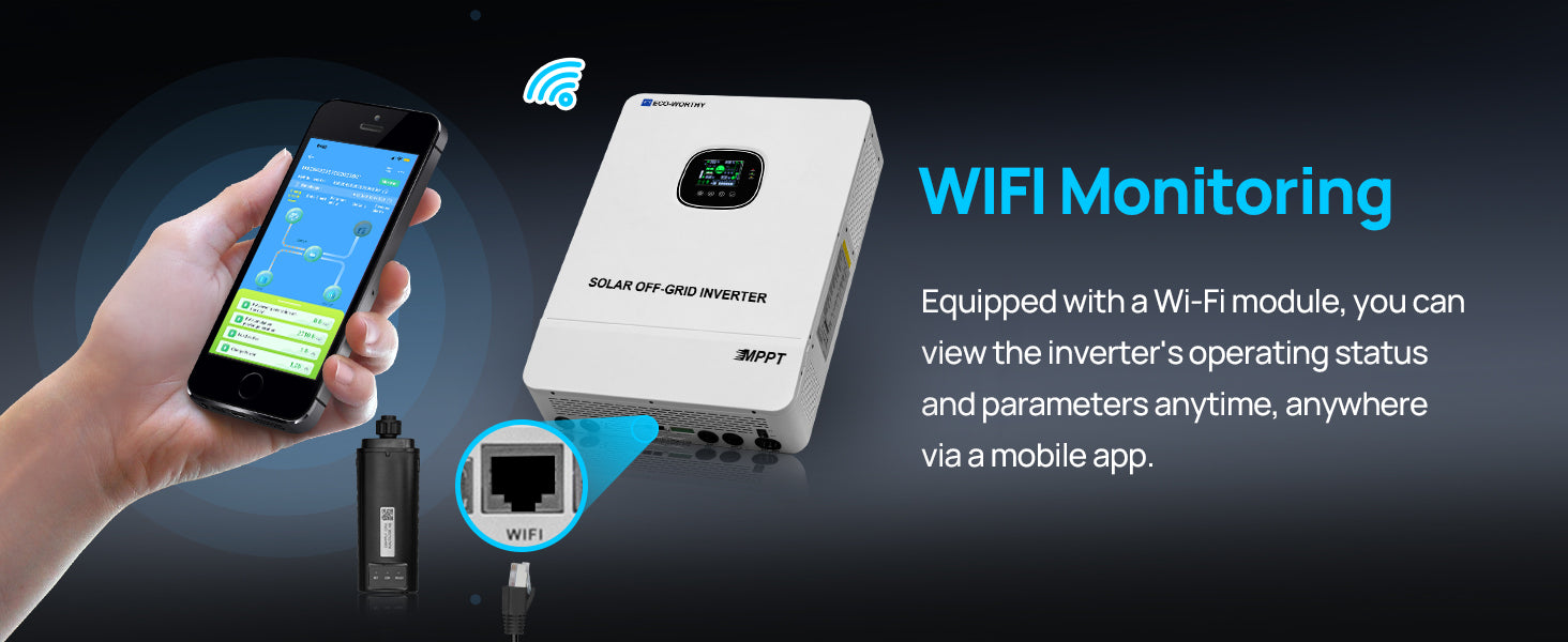 【Smart Monitoring & TOU Energy Control】Clear LED display for real-time system status and easy operation. Standard WiFi module included enables remote monitoring via mobile app. Built-in Time-of-Use (TOU) charging and discharging allows you to schedule power usage based on peak and off-peak electricity rates, maximizing solar savings.