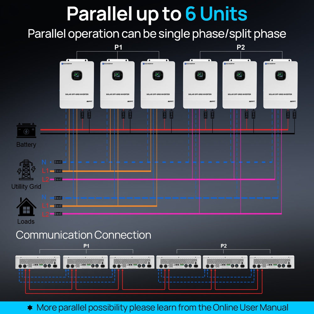 【Expandable System & Battery Compatibility Supports parallel connection of up to 6 units (60KW total output) for scalable power needs. Compatible with multiple 48V battery types, including AGM, Gel, Flooded, and Lithium batteries. Communication ports include CAN, USB, and RS485 for seamless system integration.