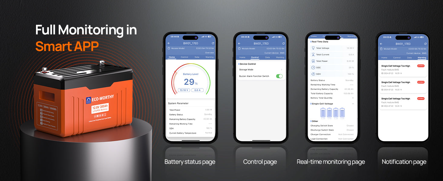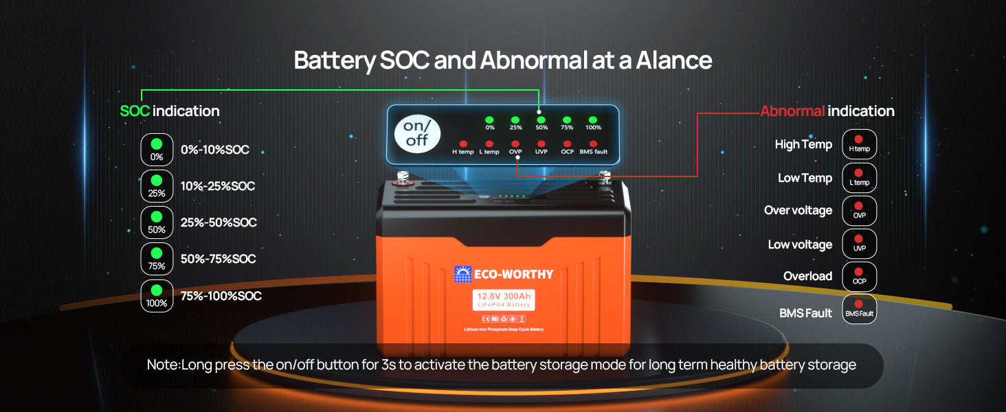 ECO-WORTHY 12V 300AH Lifepo4 Lithium Battery Bluetooth with SOC LEDs and Low Temp Protection