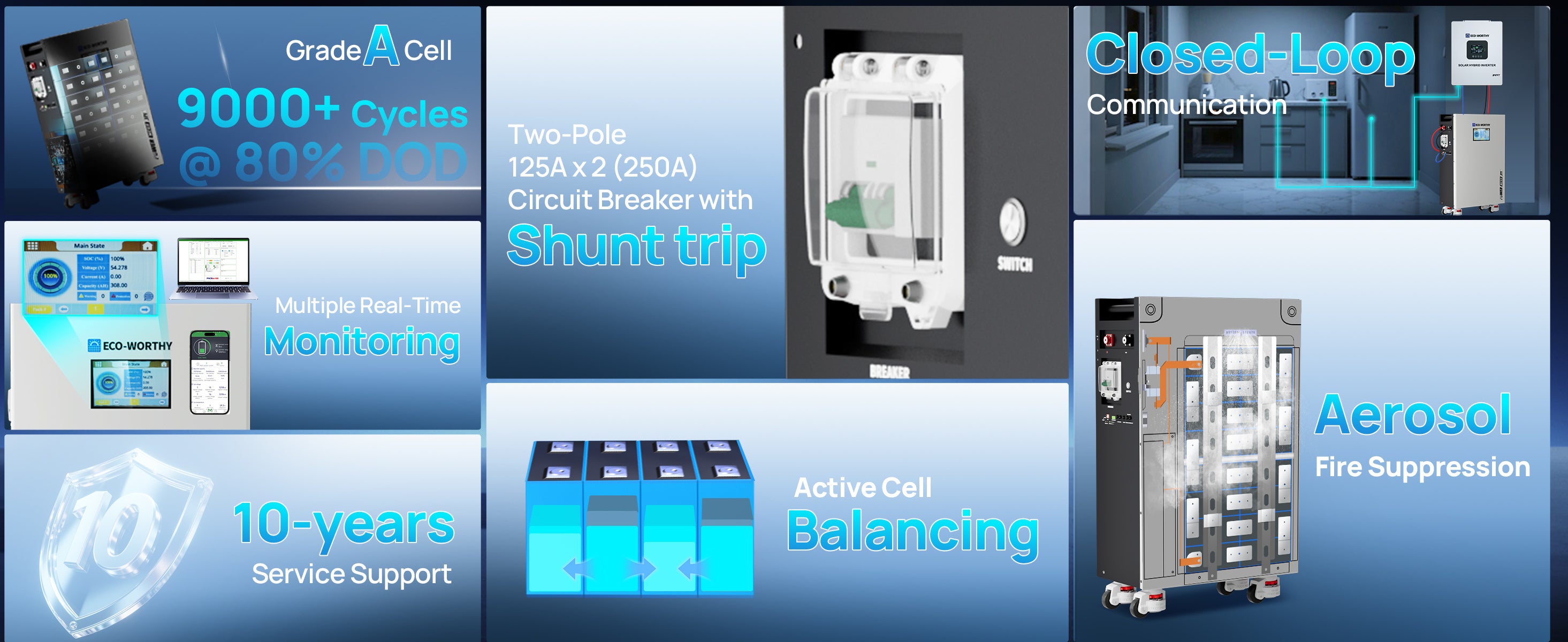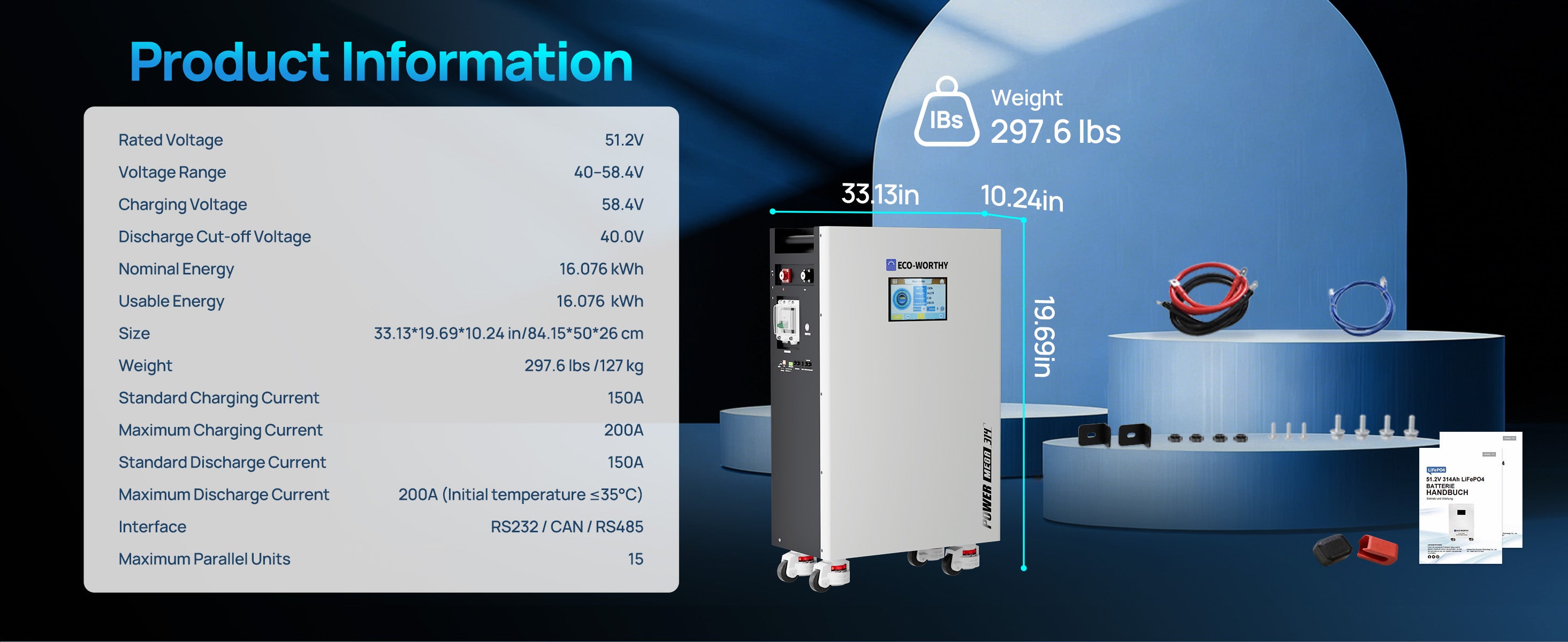 [High Capacity & Flexible Expansion] 16 Grade-A 314Ah cells provide 16.08kWh per battery. Expand up to 15 units in parallel for large-scale energy storage. [Safety Protection & Mobility] Advanced BMS with full protection features. Built-in buzzer alerts and nylon wheels for easy positioning and safe operation. [Parallel Operation & Power Flexibility] Supports up to 6 inverters in parallel (60kW max). Delivers both 110V and 220V output; battery-free mode ensures continuous load support. [Smart Charging Management] Features 3 output modes and 4 charging modes with time-based scheduling. Compatible with 10000W PV input and 20000W peak power. [Extremely Long Life] Engineered for longevity with over 10,000 cycles and 80% DOD retention, providing more than ten years of dependable service.