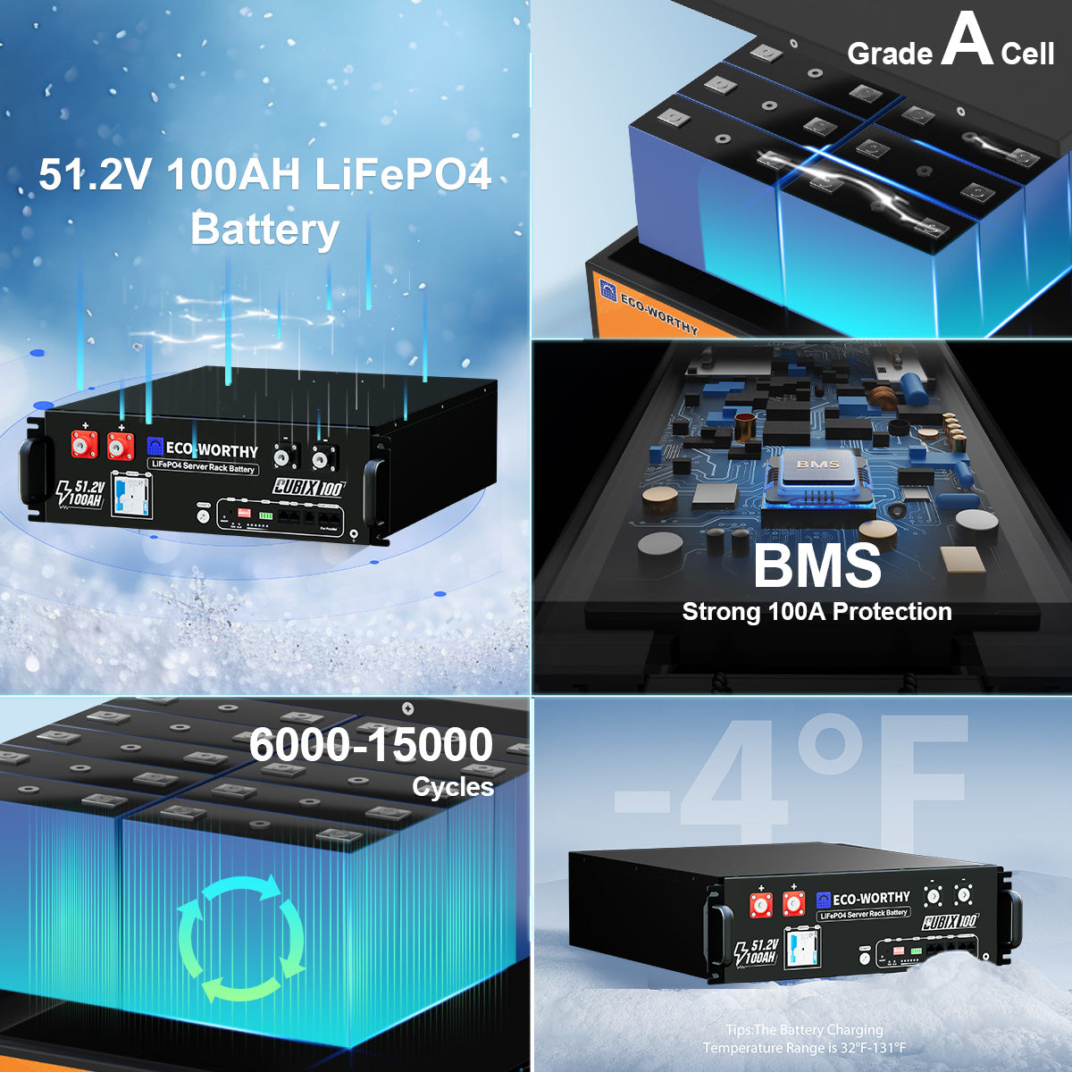 [Smart Monitoring,Seamless Compatibility] ECO-WORTHY 48V(51.2V)Server Rack Battery Supports CAN/RS485 for seamless communication with popular all-in-one solar inverters chargers.You can easily monitor your battery’s status in real-time through the mobile app, which supports both Bluetooth and WiFi connections.It can also be easily mounted in a 3U server rack to save space.