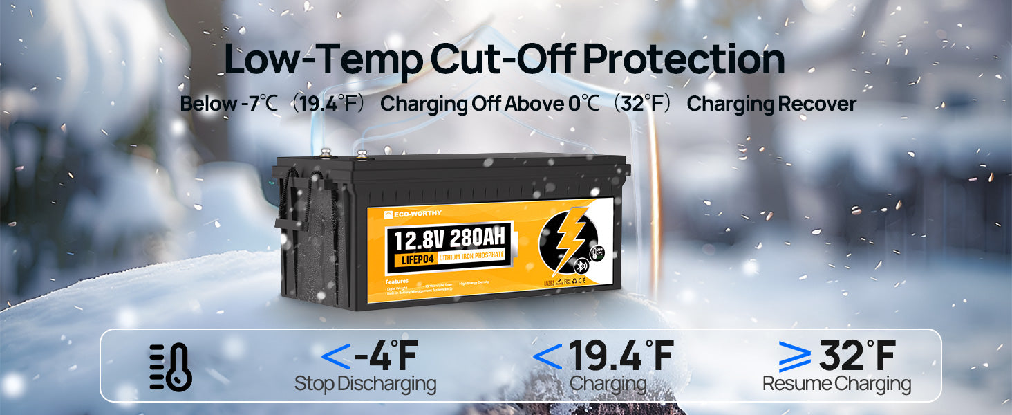 [Low-Temp Protection] This 12V 280Ah lithium trolling motor battery is equipped with low-temperature cut-off protection which automatically cuts off the battery from charging when the cell temperature is below -7℃(19.4℉) to prevent the battery cells from being damaged. Especially designed to ensure safe use for the low temperature charging environment in winter. Widely used for RV, solar off-Grid system, boat, camper, marine, travel trailer, motor homes, etc.