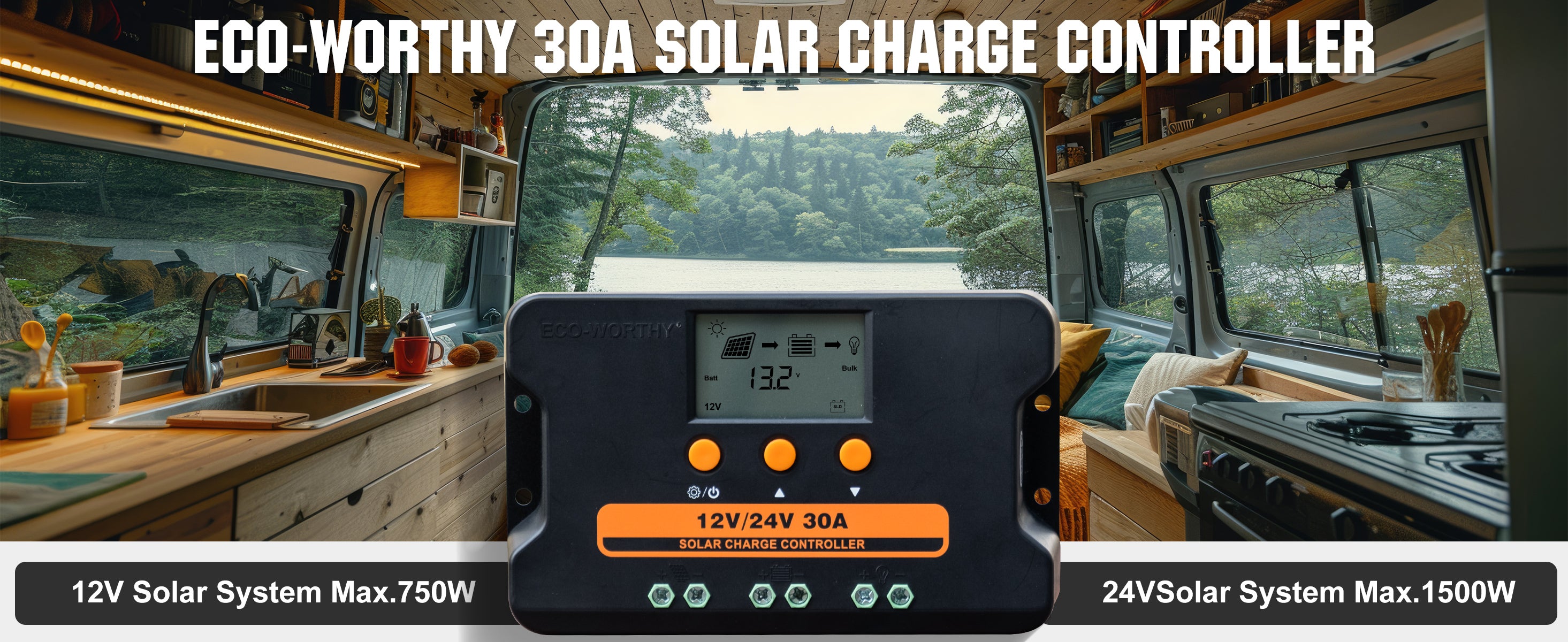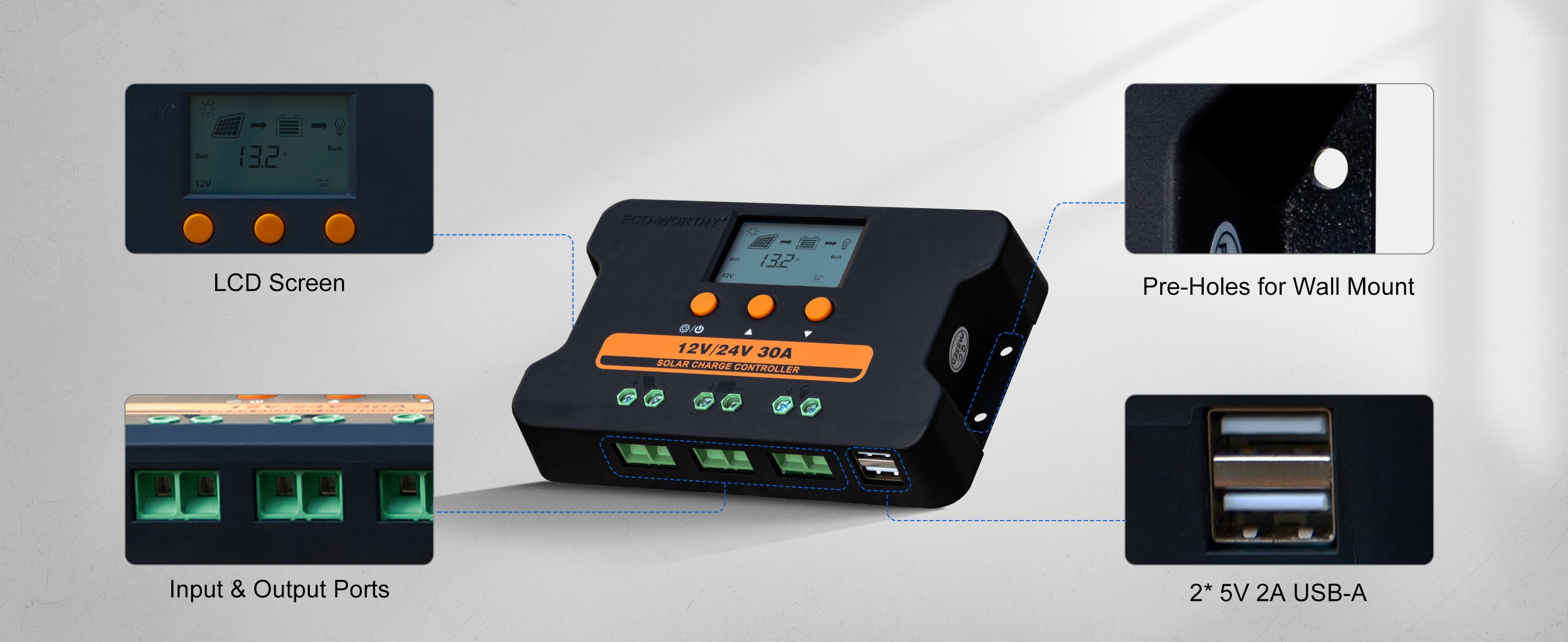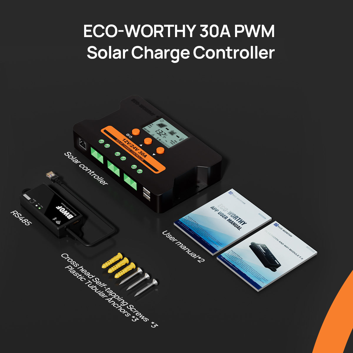 ECO-WORTHY upgraded 30A PWM Solar Charge Controller with improved internal components. Automatically detects 12V/24V DC system voltage, maximum discharge current of 30A, supporting a maximum system power of 12V 750W; 24V 1500W. Built-in dual USB outputs 5V/2A for charging your devices on-the-go.