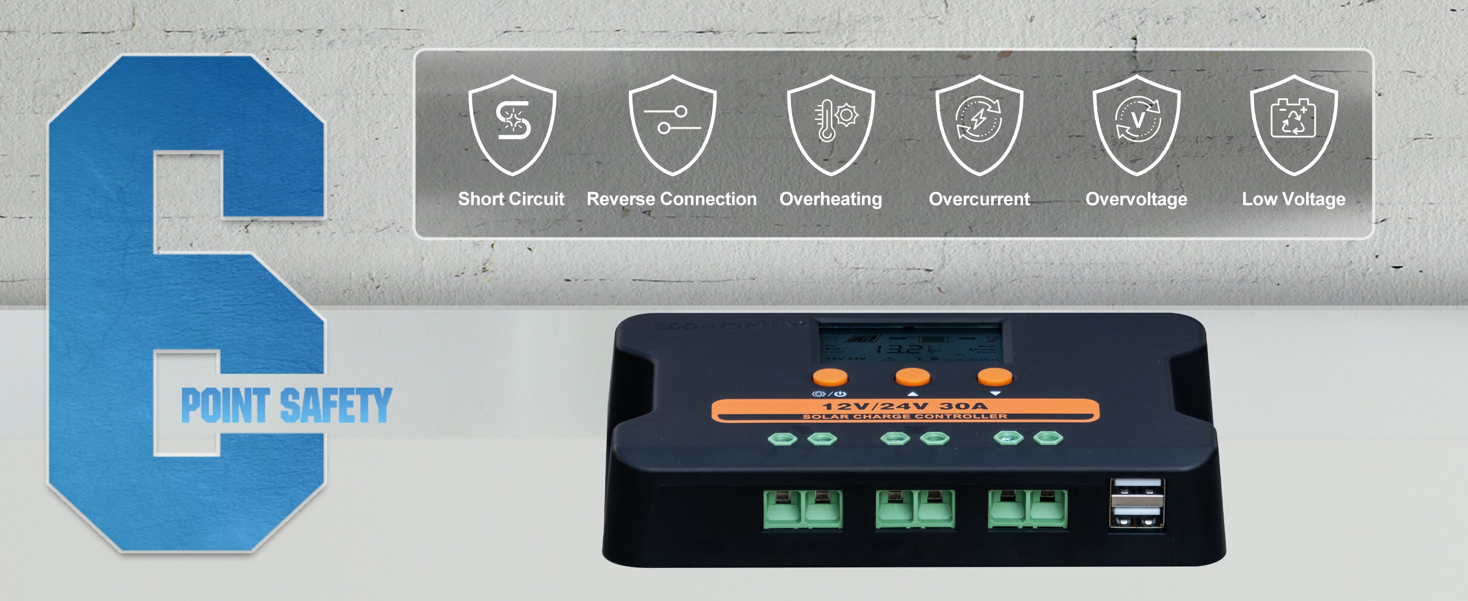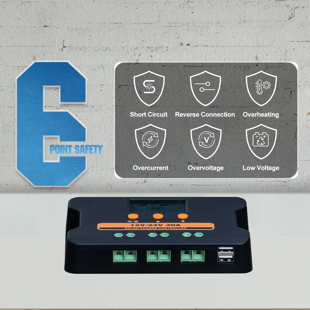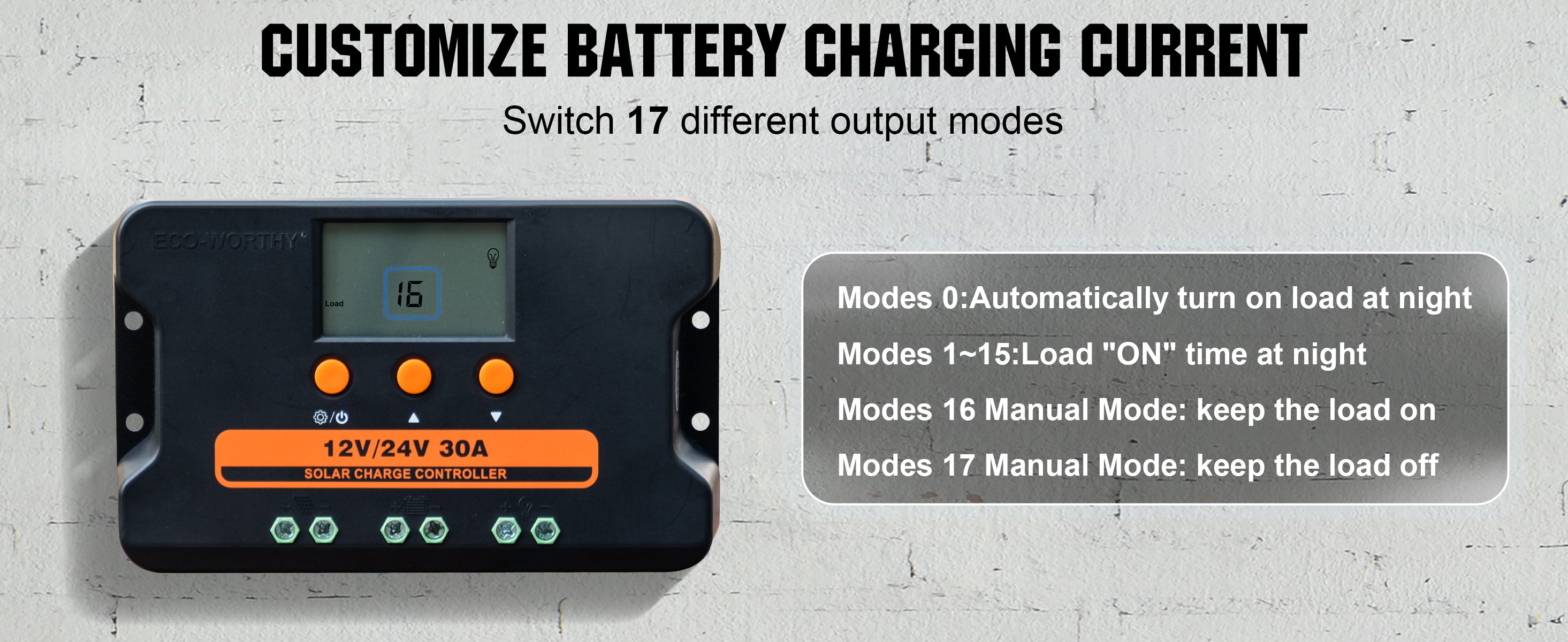 ECO-WORTHY upgraded 30A PWM Solar Charge Controller with improved internal components. Automatically detects 12V/24V DC system voltage, maximum discharge current of 30A, supporting a maximum system power of 12V 750W; 24V 1500W. Built-in dual USB outputs 5V/2A for charging your devices on-the-go.