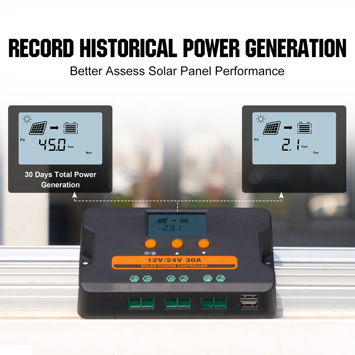 30A PWM LCD Display Solar Charge Controller Regulator with USB Port 12V/24V Autoswitch