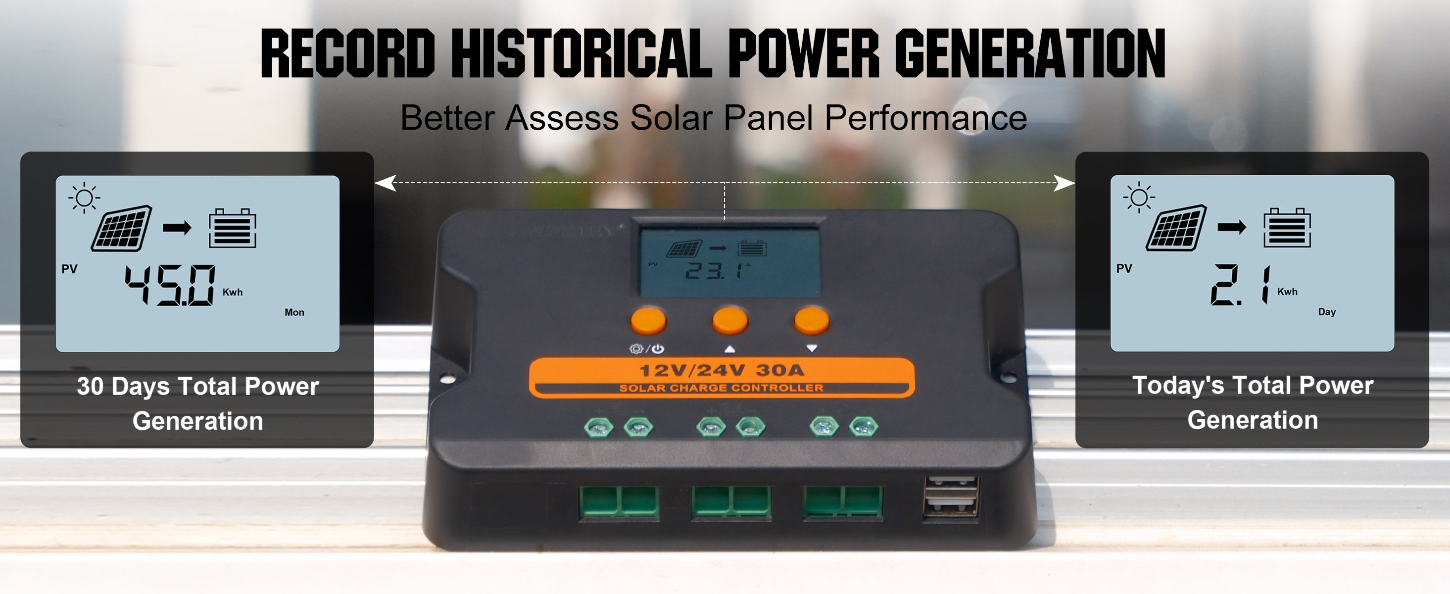 ·Newly Upgraded: Upgraded 30A PWM Solar Charge Controller with improved internal components. Automatically detects 12V/24V DC system voltage, maximum discharge current of 30A, supporting a maximum system power of 12V 750W; 24V 1500W. Built-in dual USB outputs 5V/2A for charging your devices on-the-go. ·Compatible with All Batteries: Compatible with all 12V&24V batteries, supports custom battery parameters (CUS mode), and allows easy selection of preset battery types: LFP, FLD, SLD, GEL. ·High-Precision Measurement: Upgraded components, capable of accurately measuring current and voltage with an error of less than 1%. Equipped with a clear LCD display for accurate real-time data; New upgrade three buttons for convenient mode switching and simple parameter settings. ·Intelligent 3-Level PWM Charging: Full three-level PWM intelligent charging management (bulk, absorber, float), and multiple intelligent protections against reverse, short circuit, overcurrent, low/high voltage, overheating. Improving system efficiency and performance, extending battery lifespan. ·Widely Used: Durable metal backplate for effective heat dissipation and protection of internal components. Ideal for RV camping, boating, and more outdoor applications.